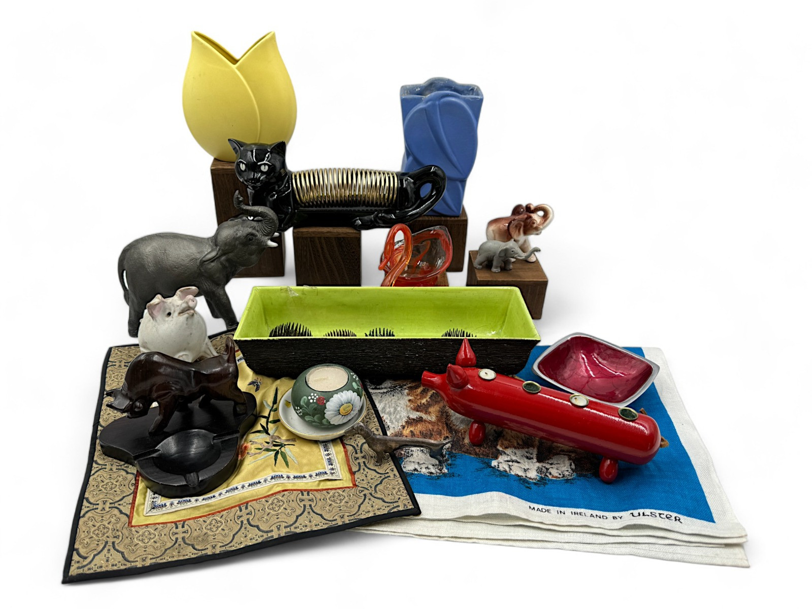6.5”T Tulip vase 10”L 1950s black cat letter holder 3.75” T swan 3.75” Weiner dog made in Germany 8”L Wooden Swedish pig