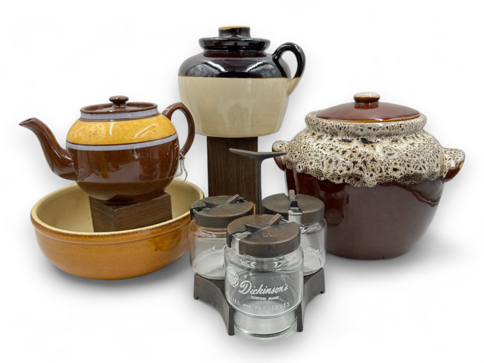 Drip glaze two handle bean pot - Approx 9”T x 10.5” handle to handle 5.5”T Sadler teapot, chip on lid. Needs cleaning 9”D Vintage Landert 22 stoneware pan 6.5”T single handle bean pot, not sure lid is original. Marked USA on base Vintage 80's Dickinson's Jelly & Preserves Condiment Jar Set And Caddy