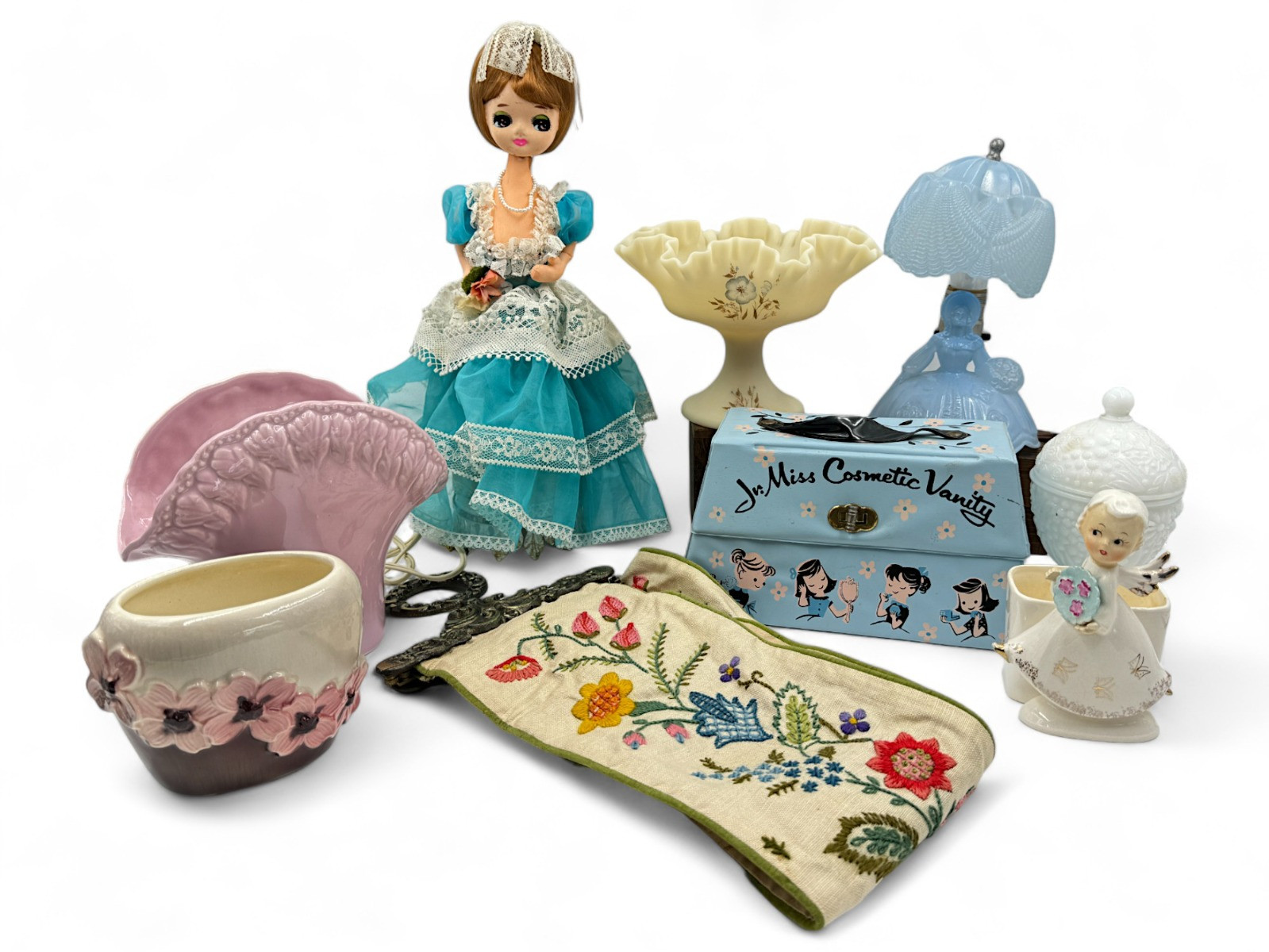 Possibly Treasure Dolls By Kelvin light - 15.5”T - untested Southern Belle Boudoir lamp LE Smith? - untested Bell pull tapestry Ceramic vases - Doranne of CA has chip 1950s "Jr. Miss Cosmetic Vanity" Avon Milk Glass Custard Satin Fenton Pedestal Bowl - 5.75 x 8”D