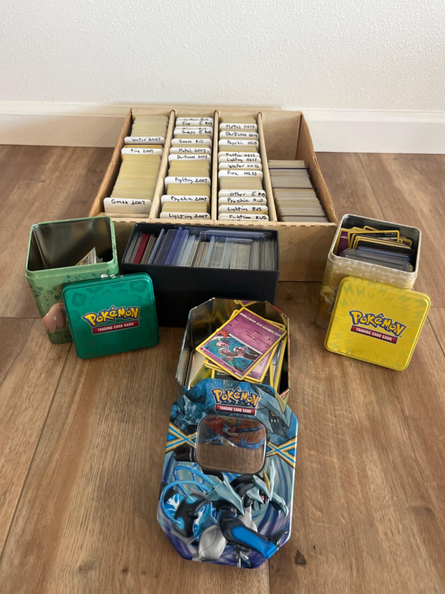 Loads of base, holo, EX, VMax, and more. The big box is all energy cards organized by mostly year and type.
