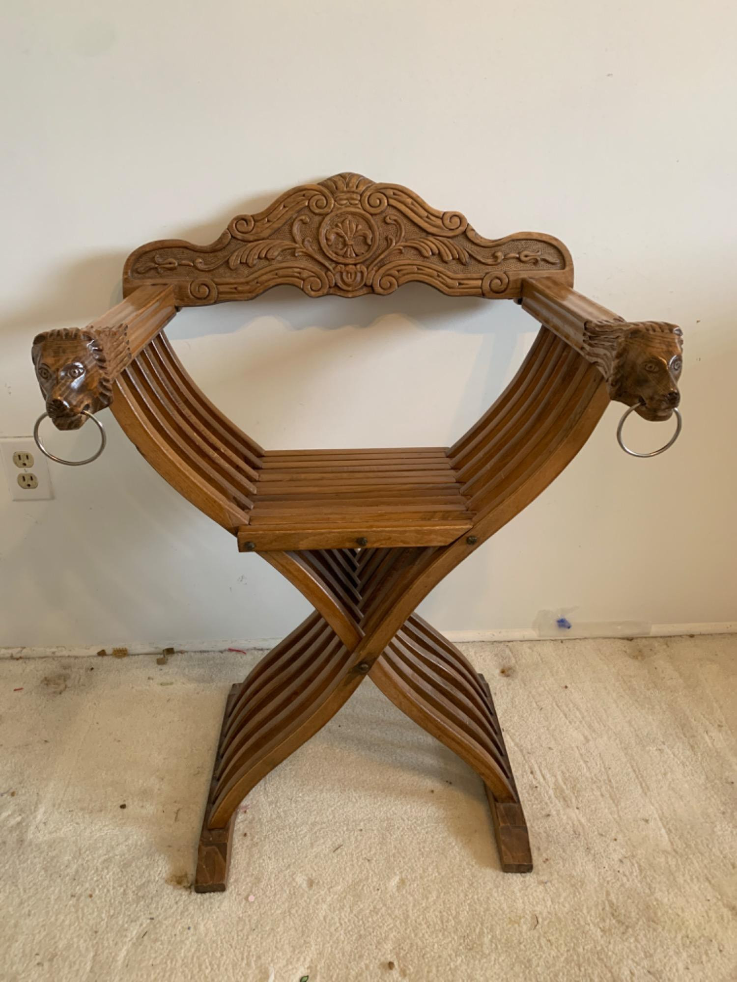 Wooden Savonarola Chair with Carved Lion Heads, 1970s #1. Lots of hand carved detail. Measures-25L x 20W x 33 T