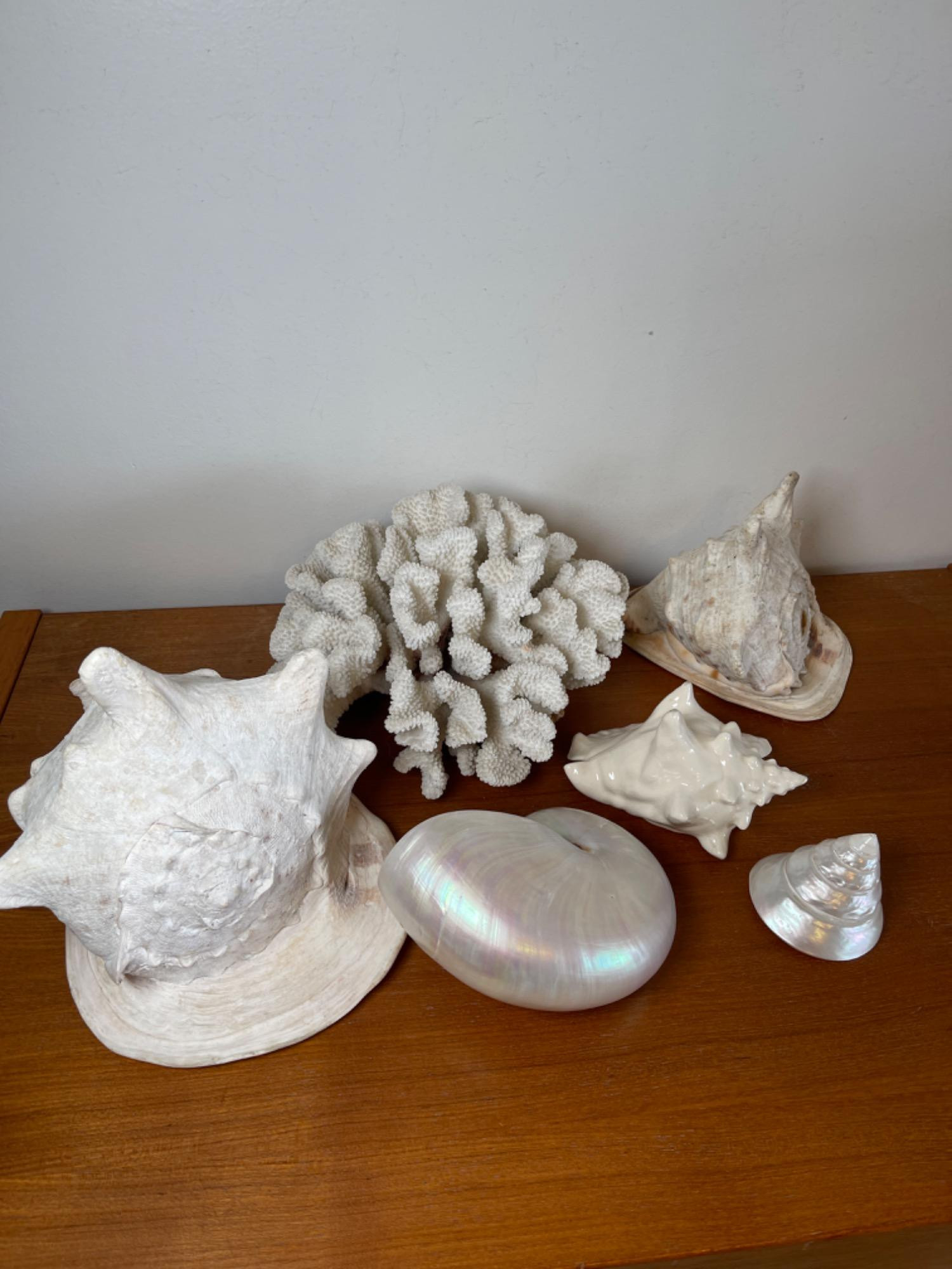Seashell variety, including coral. Measures 11 inches wide by 5 inches tall. Conch shells measure 8 and 11 inches. Ceramic shell included in this lot.