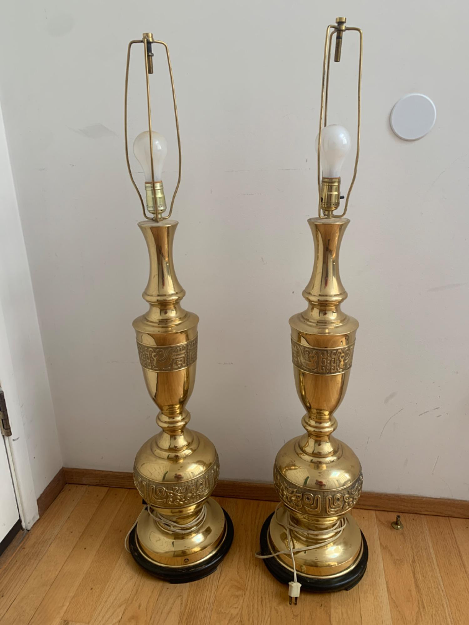Large heavy brass table lamps. Dimensions are 42T x 8W. Wood base. No shades.