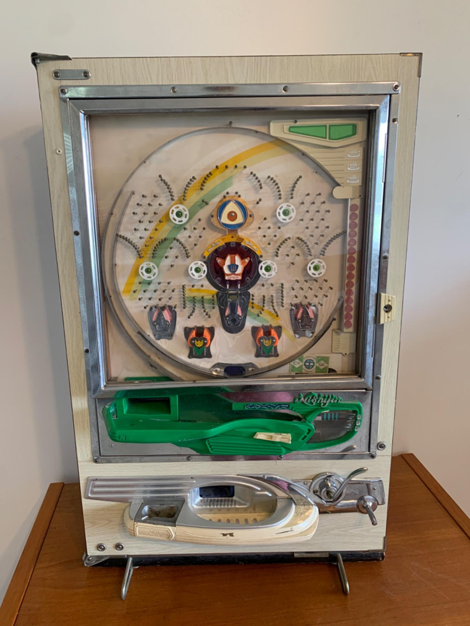 Vintage Pachinko dimensions are 20.5in long, 9in wide, 32in tall. Container of silver weighted balls included.