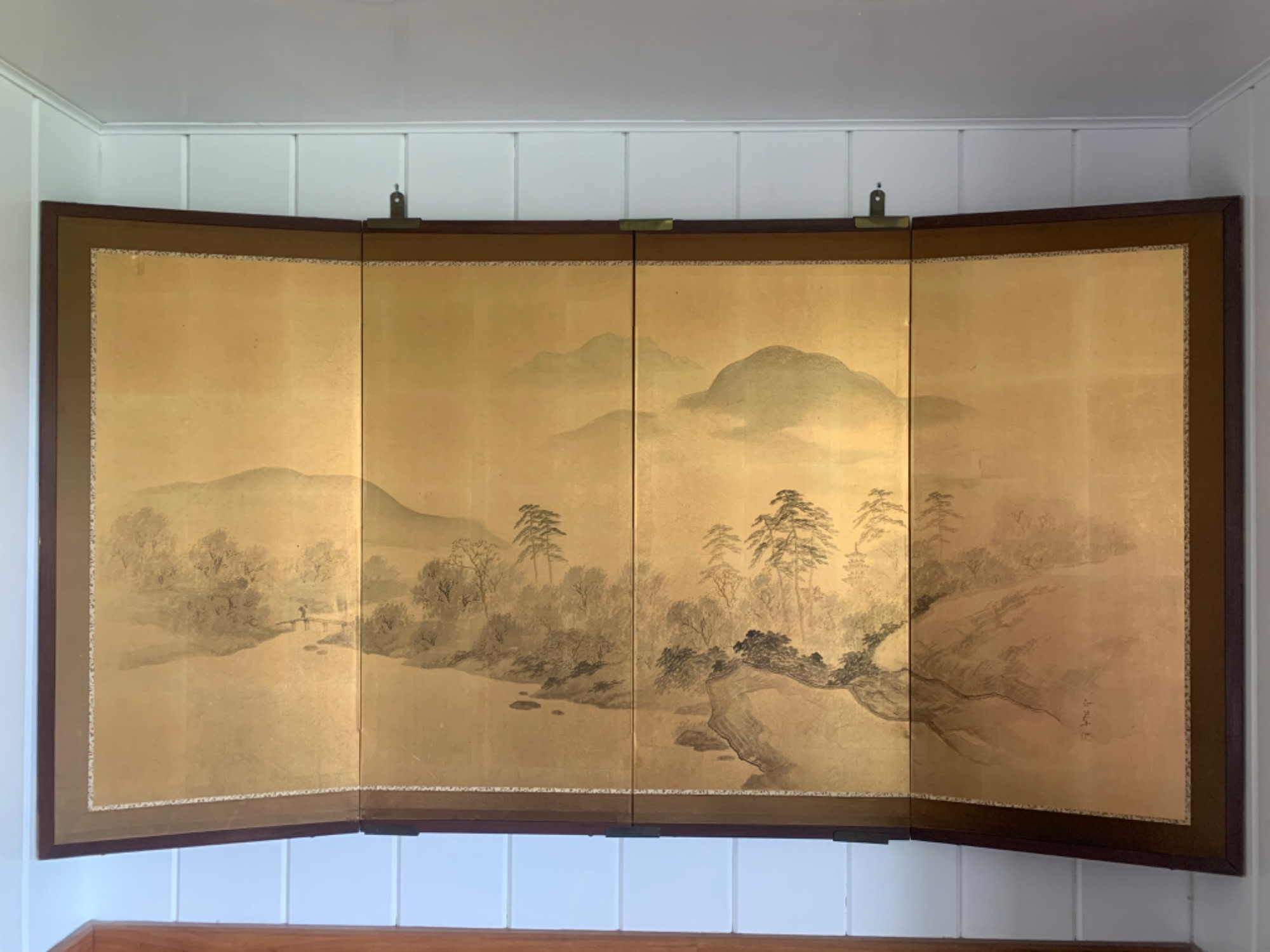 Dimensions are 66 inches long approximately, 36 inches tall. Mounting brackets included. Double sided silk panels. Beautiful art detail on both sides. One in color and the other in subdued black and gold.