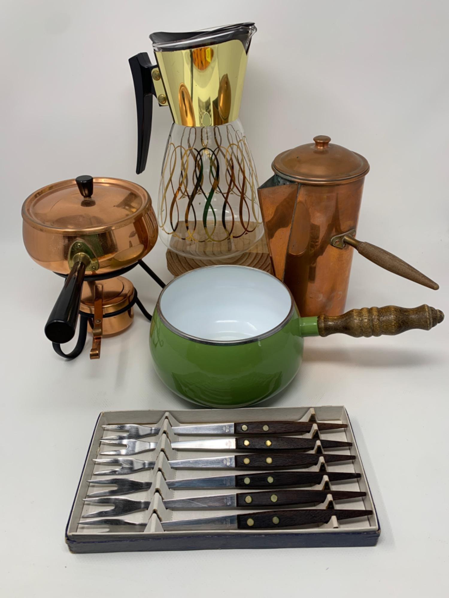 Collection of mid-century modern kitchenware. Fondue forks, copper fondue pot, green fondue pot or saucepan. Copper coffee pot. Glass and brass coffee carafe. Copper items made in Portugal and Japan. All in like new condition.