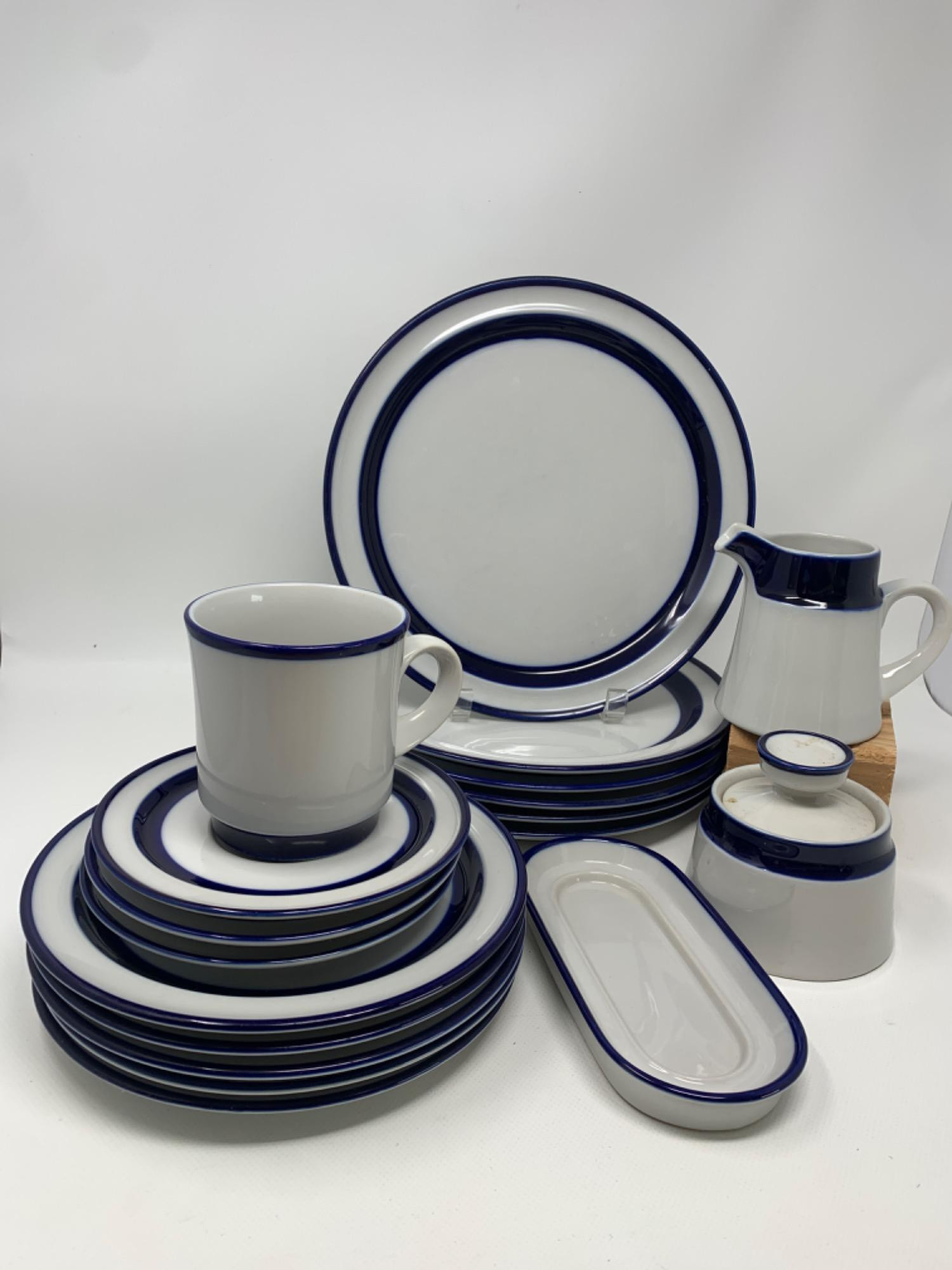 Six dinner plates, six salad plates, three saucers, one mug, one butter dish, one creamer and one sugar dish. One plate has a chip. Navy blue and white. Two bowls and one salad plate added after photos.