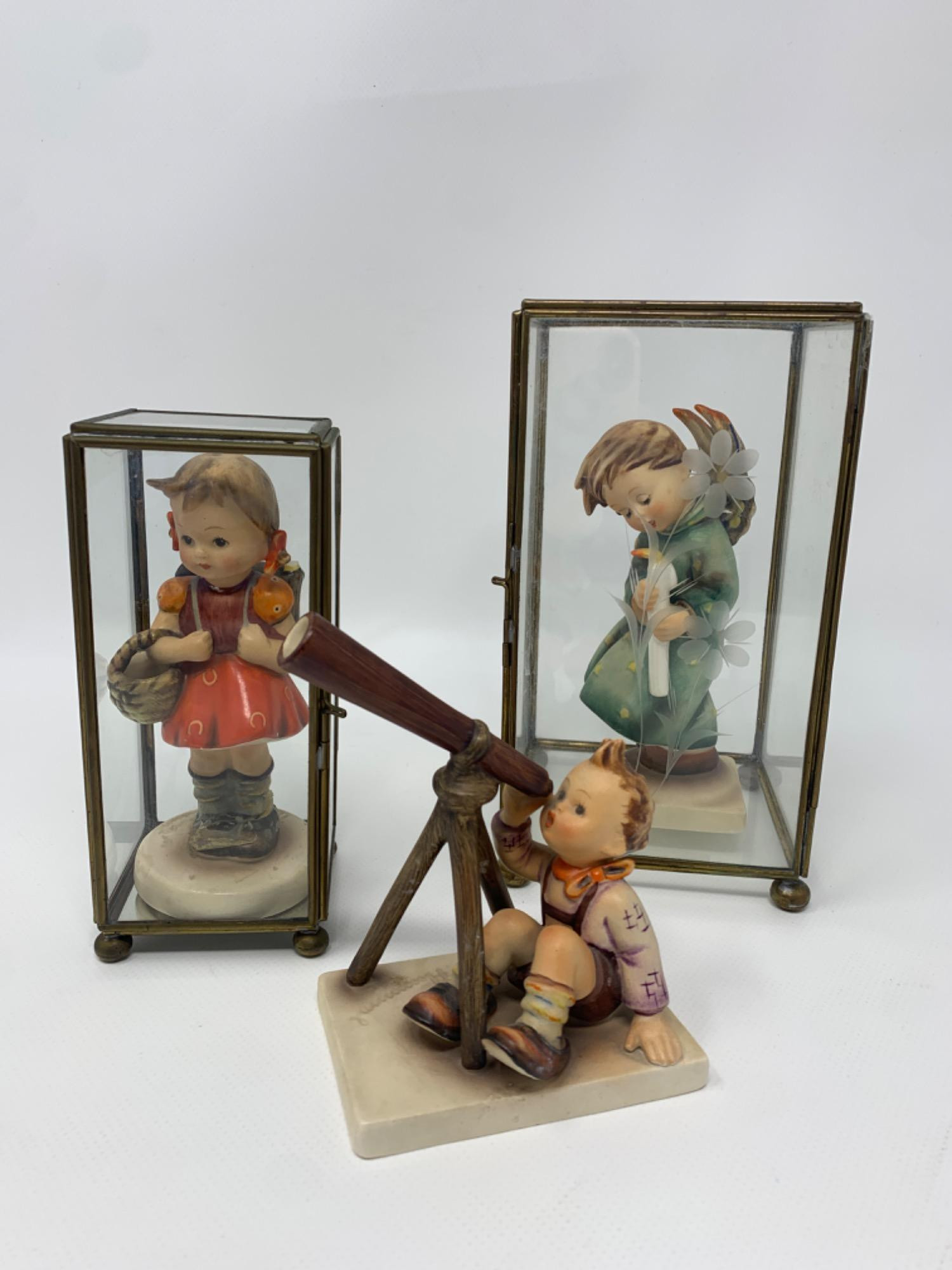 3 charming Hummel collectables. Two with glass display case.