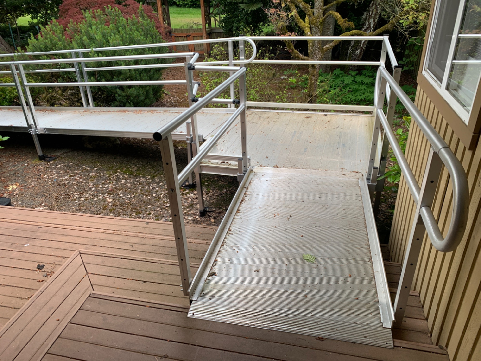 Steel mobility ramp is modular and adjustable. 39.5 inches wide on the narrow end. Approximately 30 feet long. 142 inches from the landing to the narrow end. Landing is 63 inches wide. Height is adjustable. Ramp is modifiable for your needs. Disassembly required. Bring tools. Easy load location. Platform is 23.5in tall. Railing is 58.5in tall.