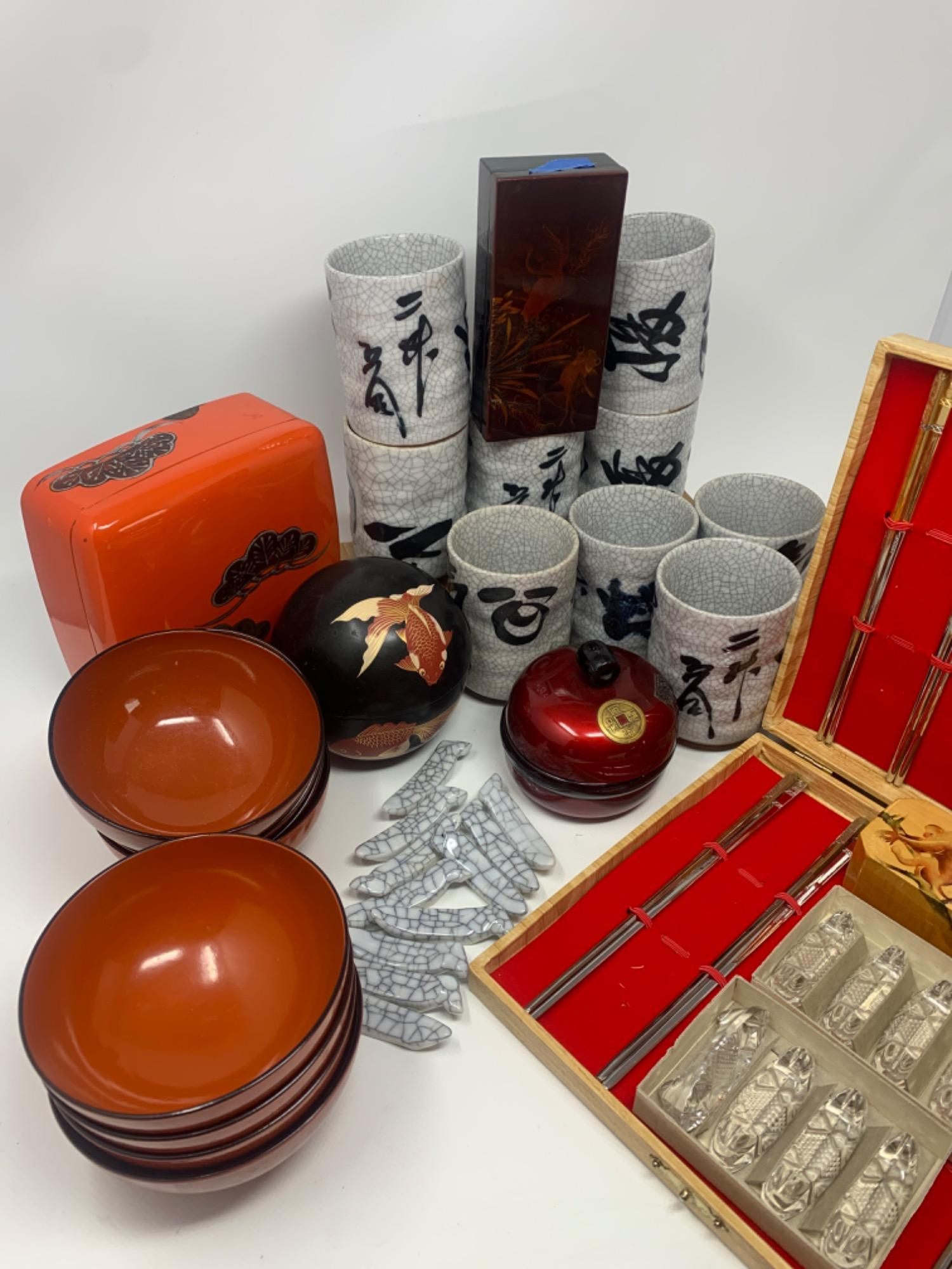 Set of nine calligraphy and crackle pottery sake cups. Travel case of metal chopsticks. Glass and pottery chopstick holders. Bamboo soup bowls. Bamboo box, painted Koi ball. Decorative coaster set with case.