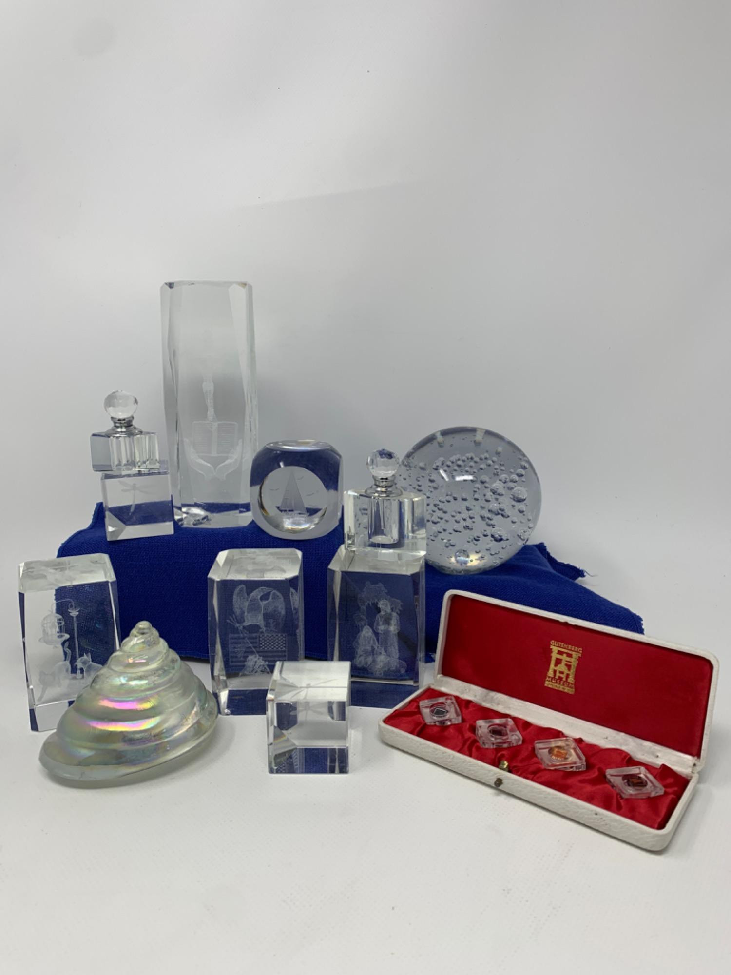 Six etched glass collectibles, two glass perfume bottles, glass shell, glass bubble paperweight, Gutenberg museum glass souvenir.