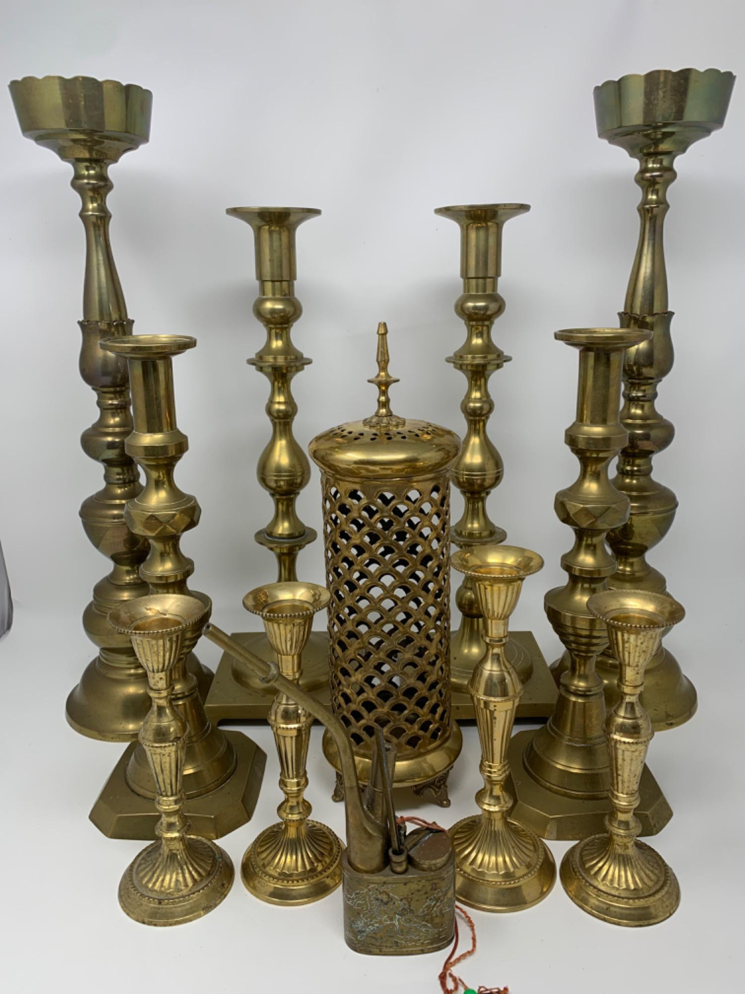 Variety of sizes shapes and styles. Largest are 18 inches tall. Four sizes of brass candlesticks. One opium water pipe. One caged candlestick holder.