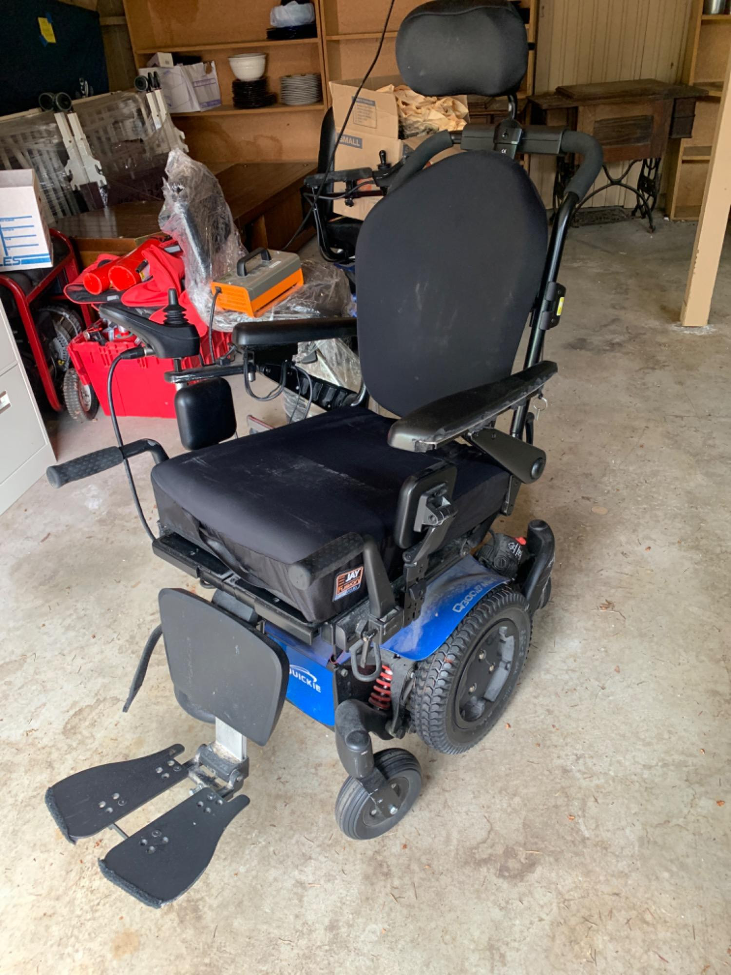 Q 300 mini electric wheelchair. Includes portable battery charger. Does power up. Adjustable seat, height, and tilt. Tires are in good condition. Adjustable headrest. Some minor wear to armrest. Dimensions are 39 inches long, 20 wide, 51 inches tall. Removable seat cushion. Many features and settings. Will remain plugged in to power until pick up. Manuals included.