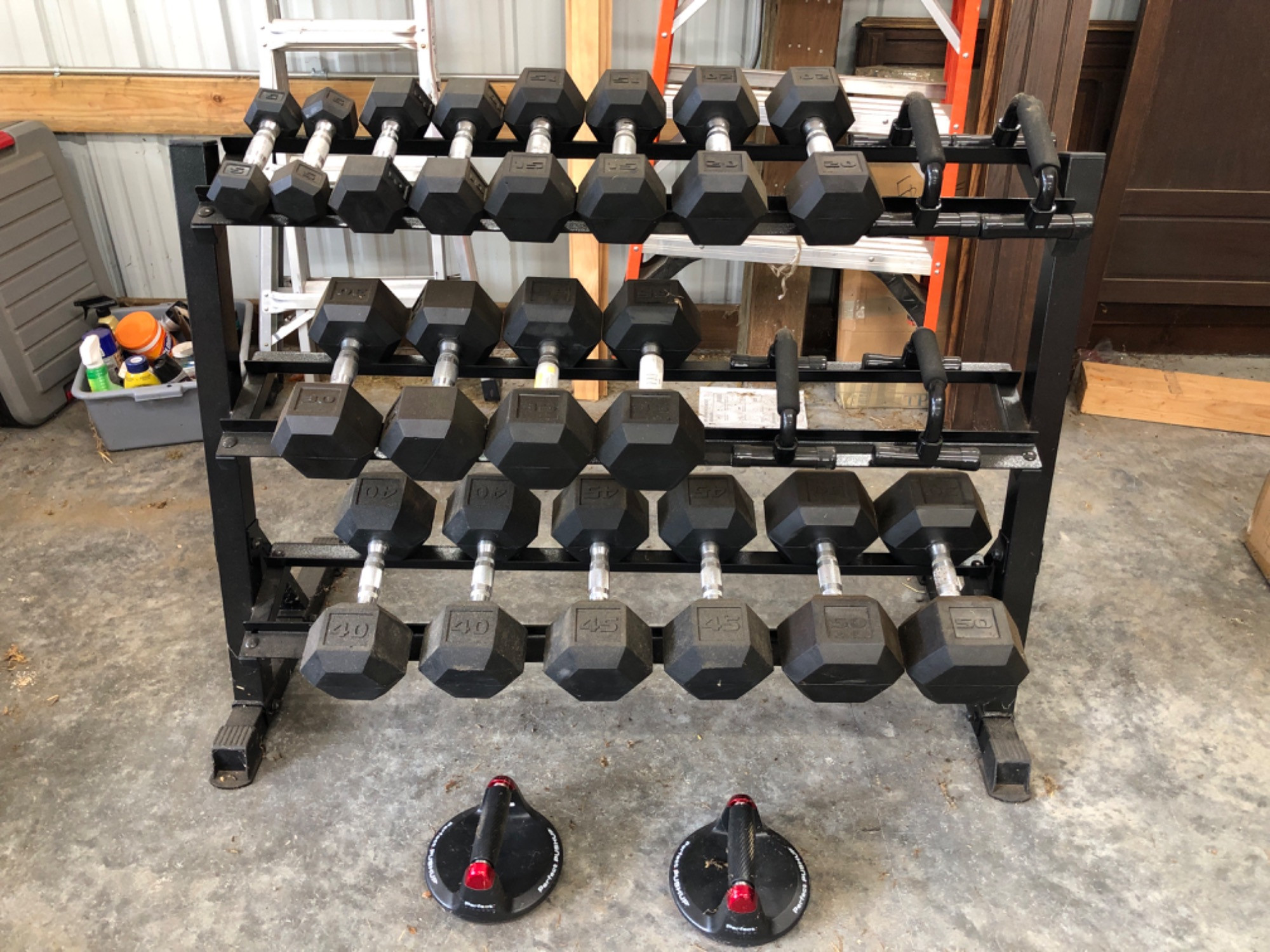 Hex Dumbbell (LB) Sets with Rack Weights included (in lbs) - 5.10,15,20,30,35,40,45,50 Push up handles included Rack height - 3 feet Rack width - 52