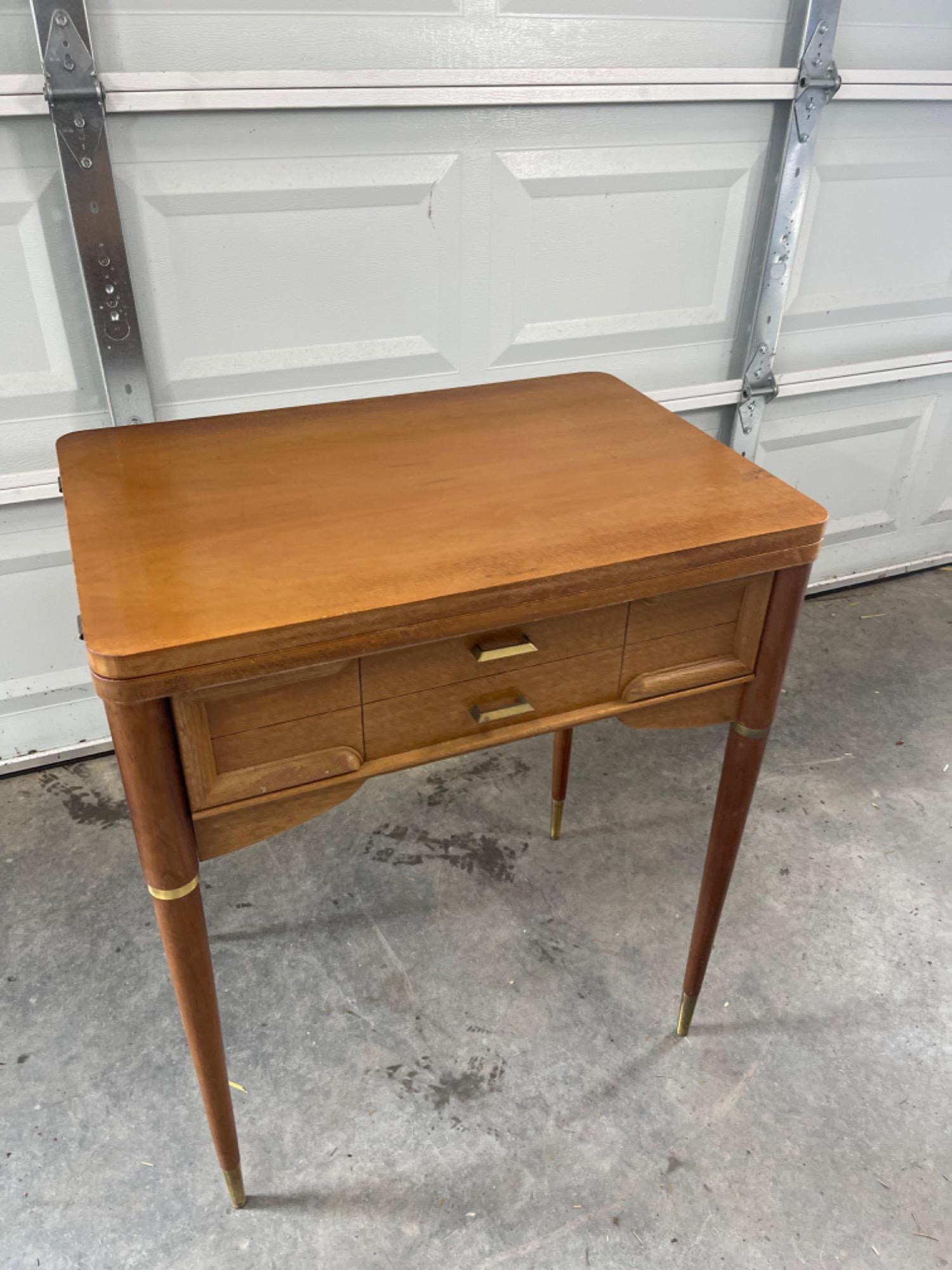 26W x 18D x 32T Mid Century Sewing Table With a Singer Sewing Machine. Sewing machine not tested.