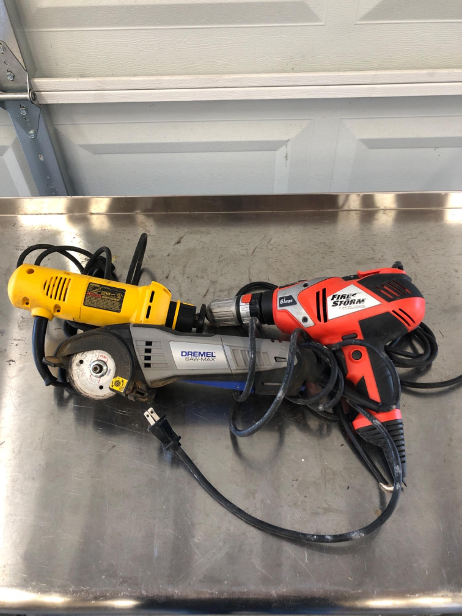 3 Electric Hand Tools Includes: DeWalt DW660 Cut-Out Tool Dremel Saw Max Tool Kit Black&Decker "Firestorm" 6 amp 3/18" drill All Working