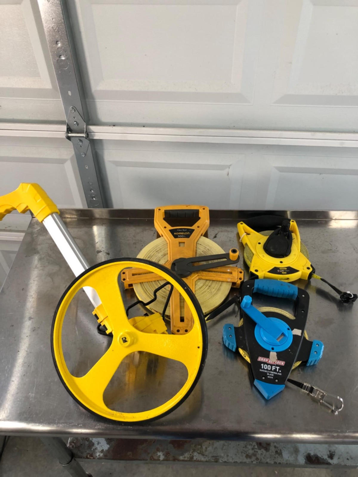 3 Fiberglass Long Tape Measures & Rolotape Wheel Lot Includes: Komelon 300ft Fiber Reel Tape ChannelLock 100ft Fiberglass Tape Stanley FatMax 100ft Fiberglass Tape Rolotape Wheel - Model RT312