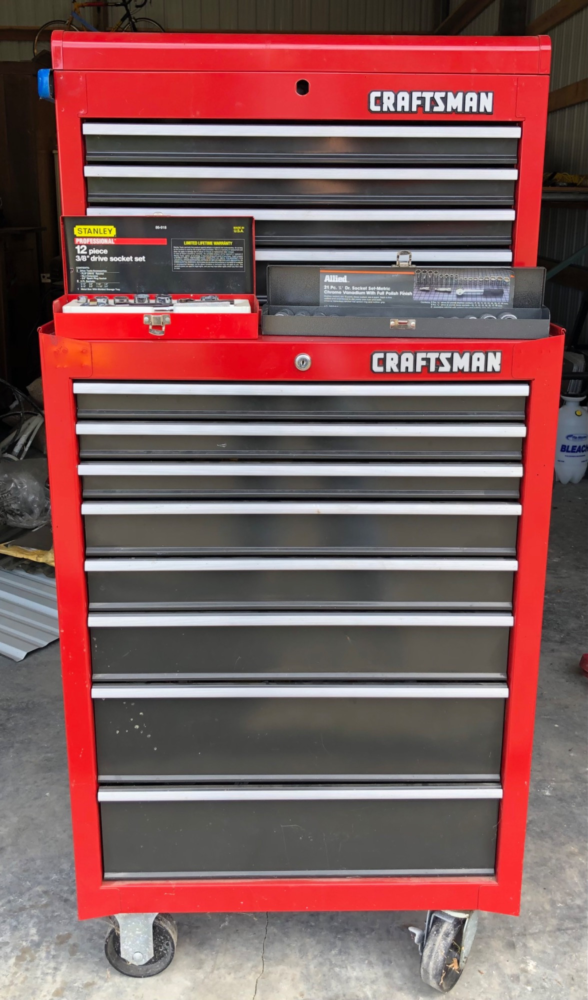Craftsman Rolling Tool Box - 12 Drawers Loaded with hand tools and some power tools Extra sets of rachets and sockets Dimensions: 56 inches high x 27 inches wide x 18 inches deep