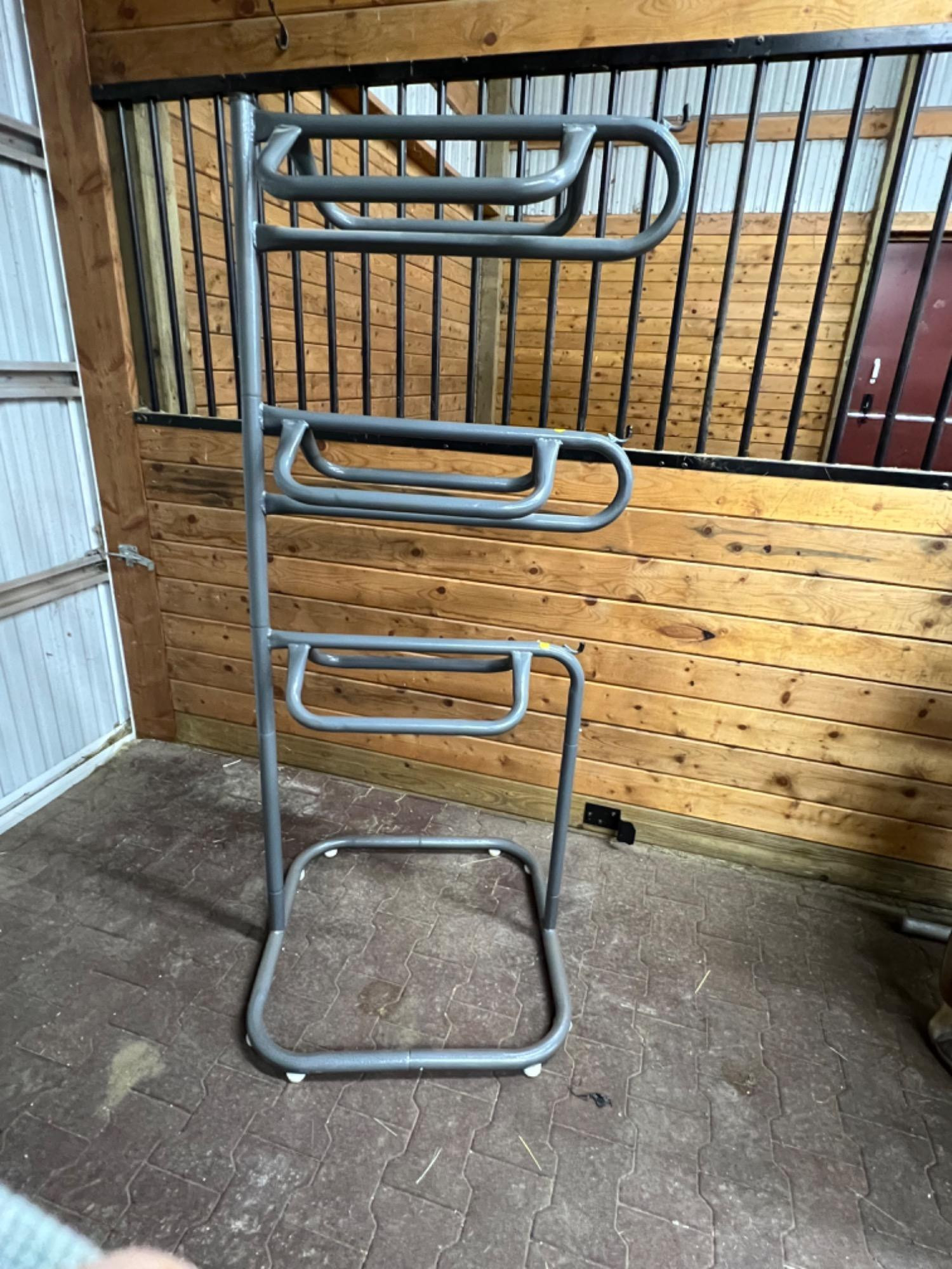Metal saddle rack with 3 hangers. There are 4 sections that fit together to be able to stack and store 3 saddles. 70" tall x 28" deep x 28" wide