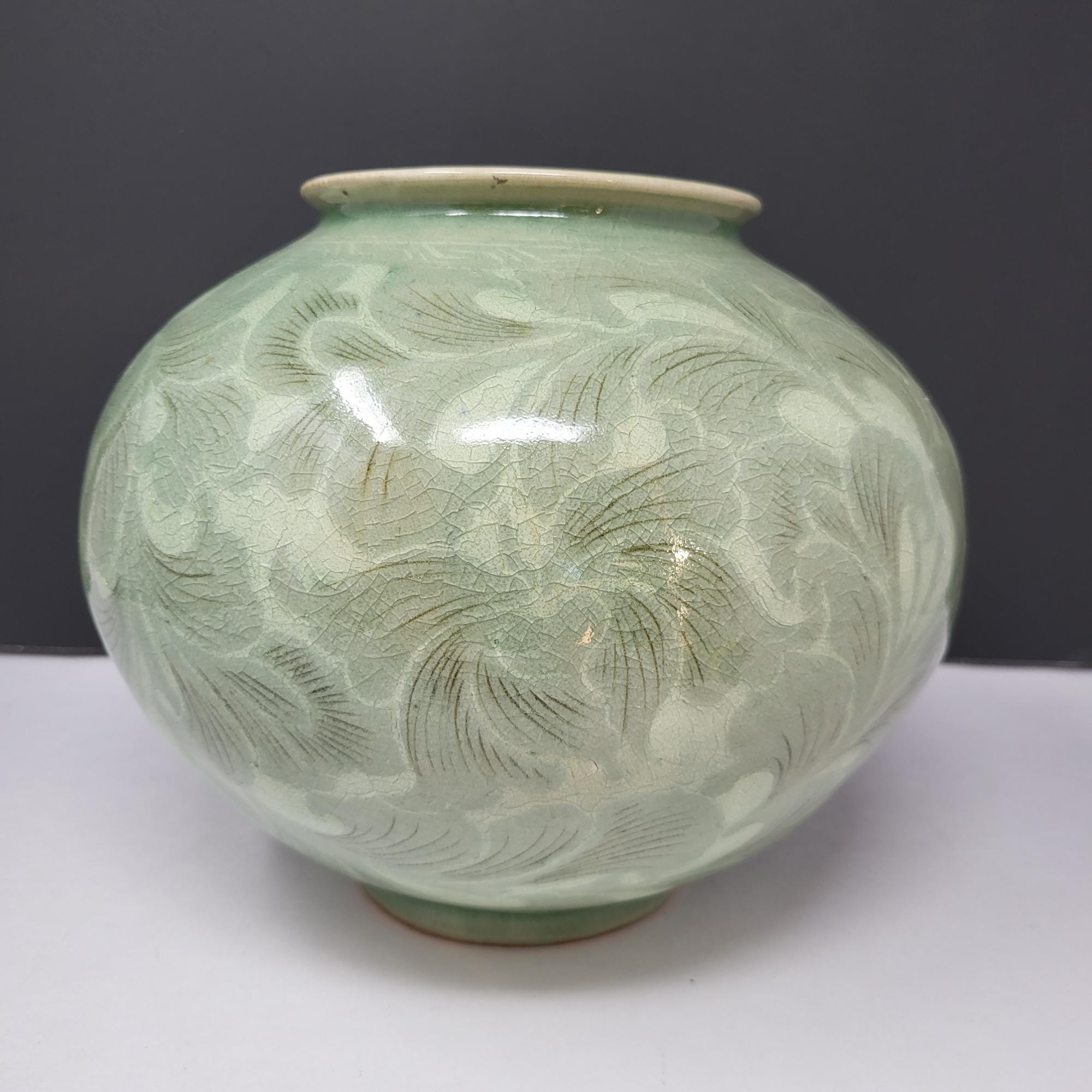 Sage green, glazed, Chinese Celadon vase. Beautiful crazing, leaf pattern, measures 9" at widest x 7.75" tall with 4" opening. It's unmarked though is an exceptional quality piece.