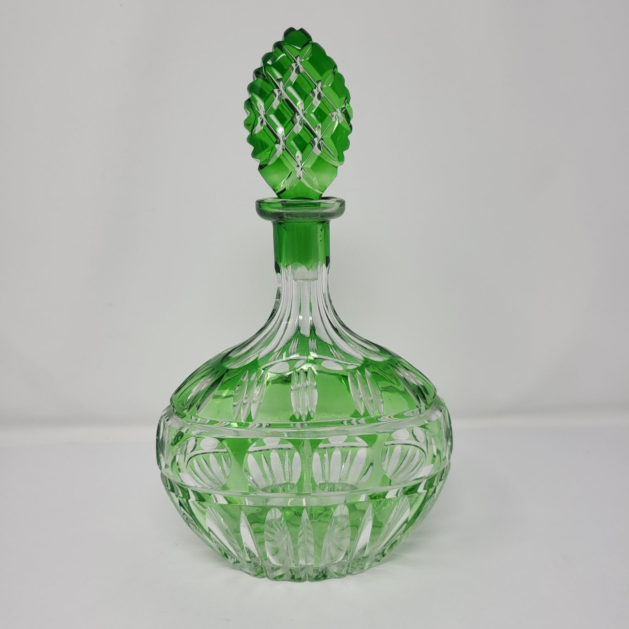Stunning, Bohemian/Czech green & clear cut crystal decanter measures 11" tall x 6.25" wide x 3.5" deep. Diamond cut cross cross stopper. Gorgeous detail.