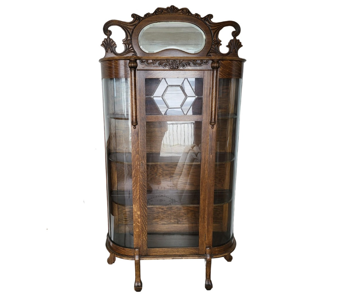 Quality craftsmanship, antique dark oak curio/china cabinet features curved glass sides, a decorative leaded glass pane, and carved wood, framed-in beveled mirror. Four shelf curio, (3) have slits to display plates upright, front locking glass door with skeleton key. Measures 74" tall x 37" wide x 11" deep. Bidding on this lot is an agreement that: (1.) You will have 2 capable, able bodied persons to lift and load at a minimum. (2.) You will bring a hand truck and/or any other tools needed to remove this item. If these steps are not followed your item will be forfeit and no refund given. Note* Item is located on main floor with two stairs to get to the door and few outside stairs leading to a 20 degree steep driveway. Parking at the top of the driveway where it is flatter will make it easier for you to load.