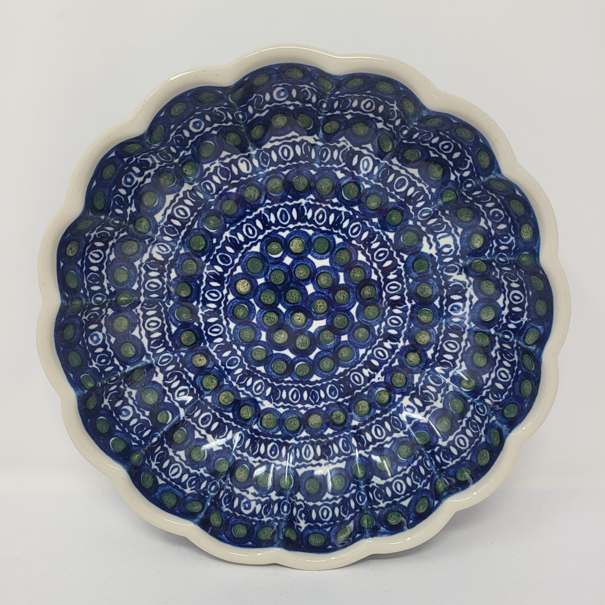 Blue, green & white glazed scalloped edge pottery dish. Made in Poland '55. Measures 9" wide x 1.5" deep