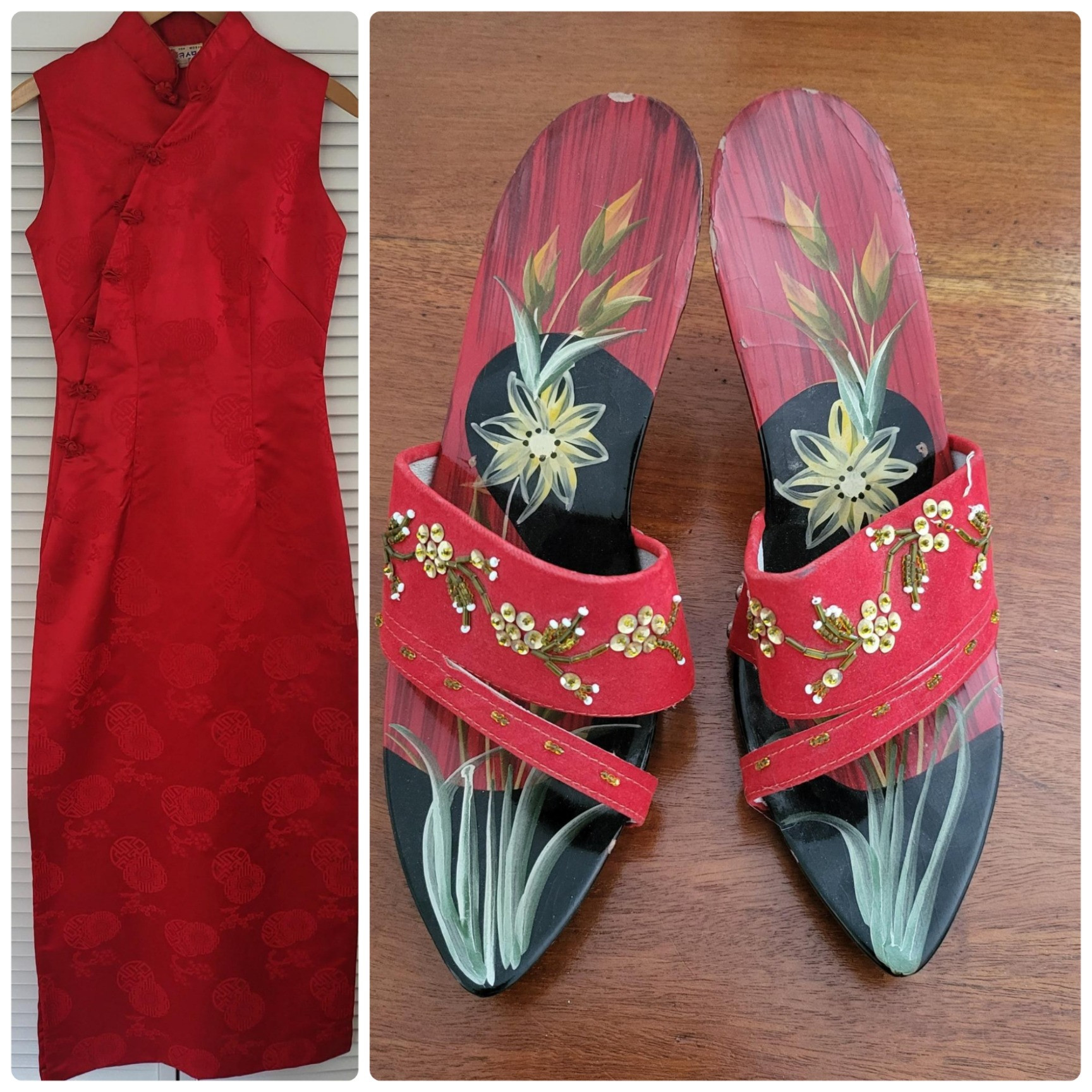 Top Mode Seoul Korea, vintage, long red silk dress with high side slit. Dress is 60" long, size Medium, 26" waist. Dakao, Vietnam, hand painted wood laquered, open toe slide on heels, size 7.