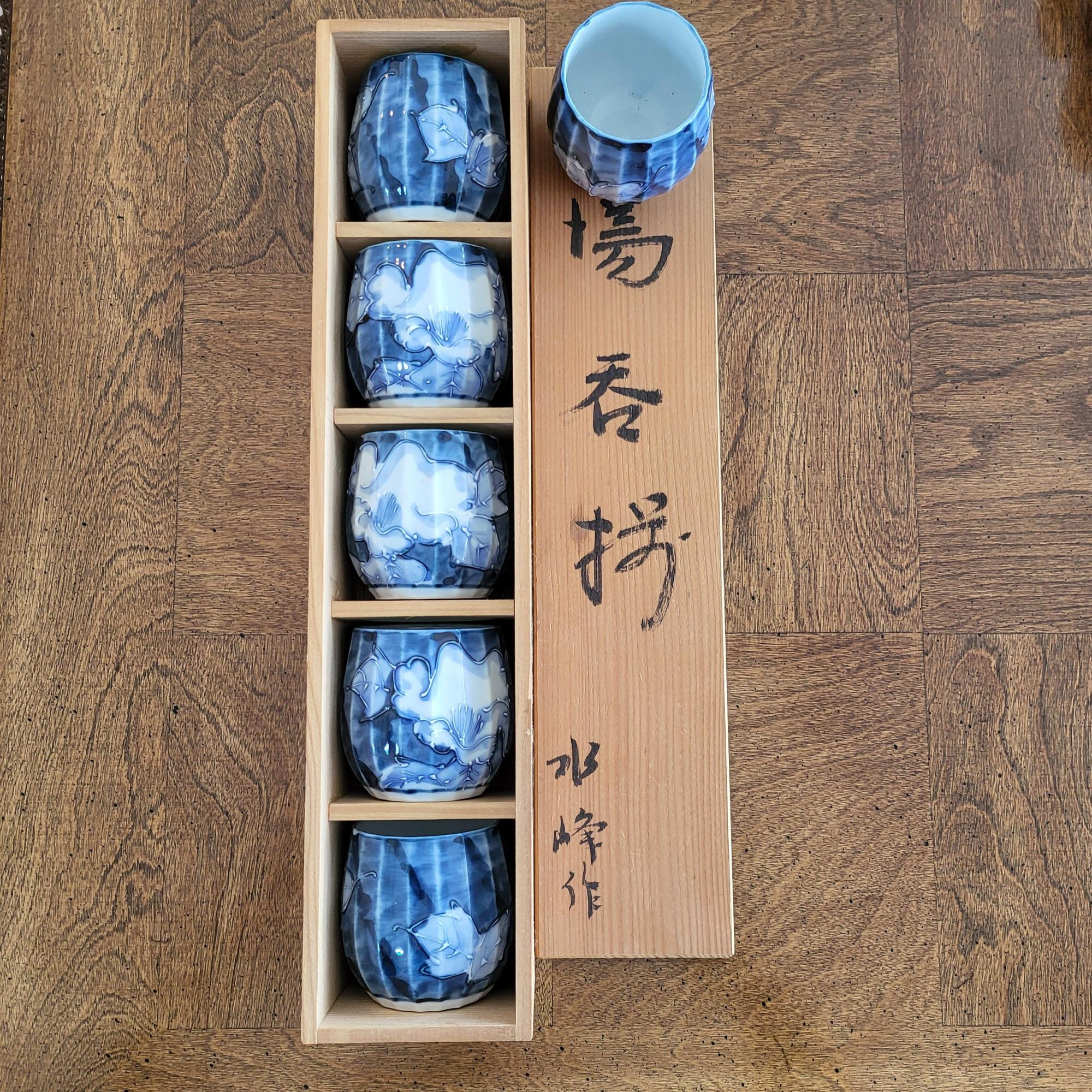 Four blue/white raised design, 3" Japanese tea cups in wood storage box, plus one extra loose one.