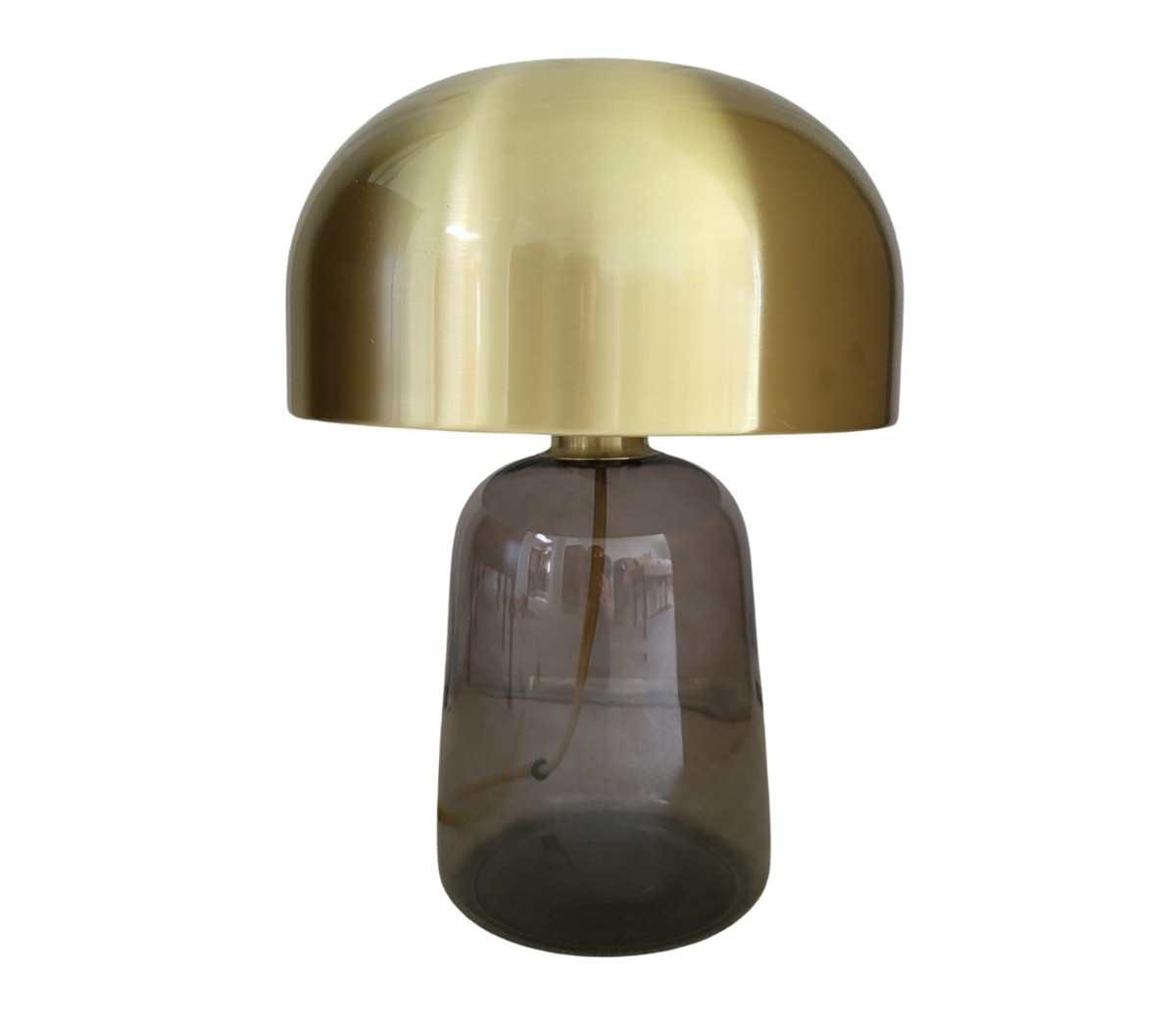 Koepel Style contemporary mushroom shaped lamp measures 18" tall x 12" wide brass shade, smoky glass base
