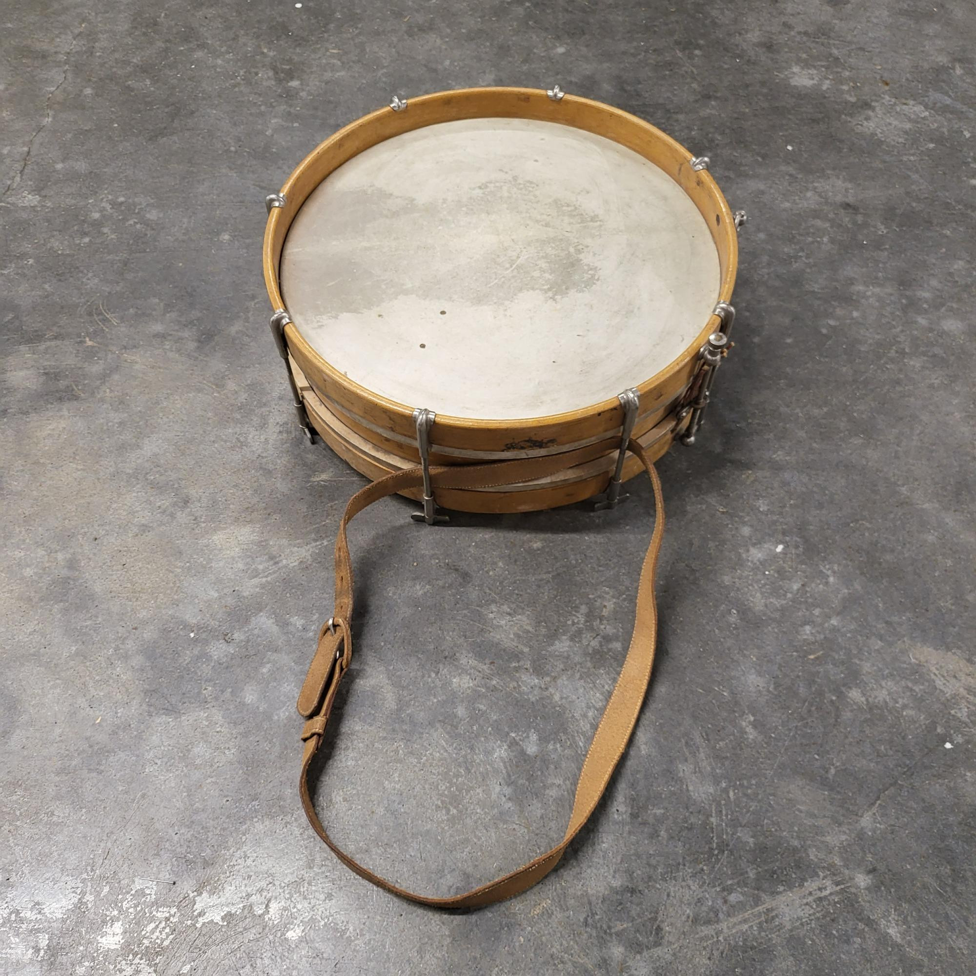 1920's snare drum with leather strap is 14.5" x 6". Drum skins are still in good shape with maple wood shell and all hardware is present. No makers mark.