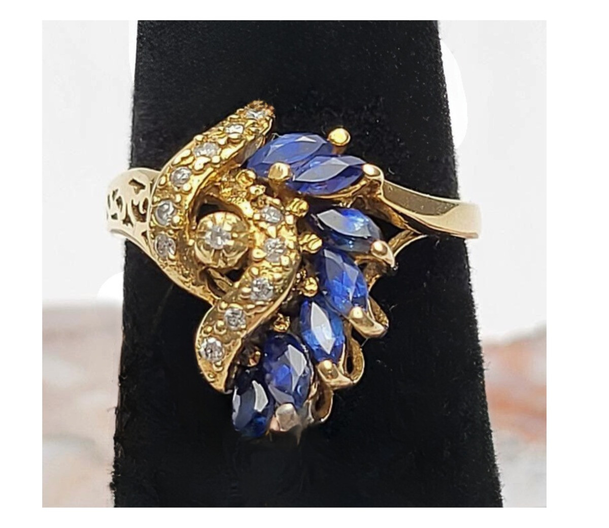 Cascading deep blue marquise cut sapphires with 12 small diamonds. 585 Gold (14k). Size 5.
