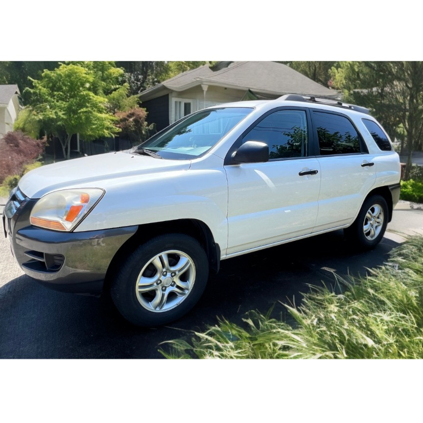 2007 KIA LX Sportage Sport Utility Passenger Vehicle. White exterior, dark grey interior. Mileage is 17,738 (original engine). VIN: KNDJF723177361760. 4 Door, V-6 engine. Two keys. Automatic transmission. Brand new vehicle battery. Front Wheel Drive. Good amount of tread on tires. Two seats front and full back seating. Back seating is folded down due to EXTRA set of four (4) studded SNOW tires already loaded in the SUV. Luggage rack installed on top of car. Original KIA mats. Clear title. Original vehicle manuals. No visible dents on body - normal road use scratches. Fabric seats. AM/FM radio and CD player. A/C. Chrome lettering on back of car is missing the "S" in Sportage. Vehicle is in working condition Buyer will be responsible for state license fees (currently expired) and tax when transferring at DMV.