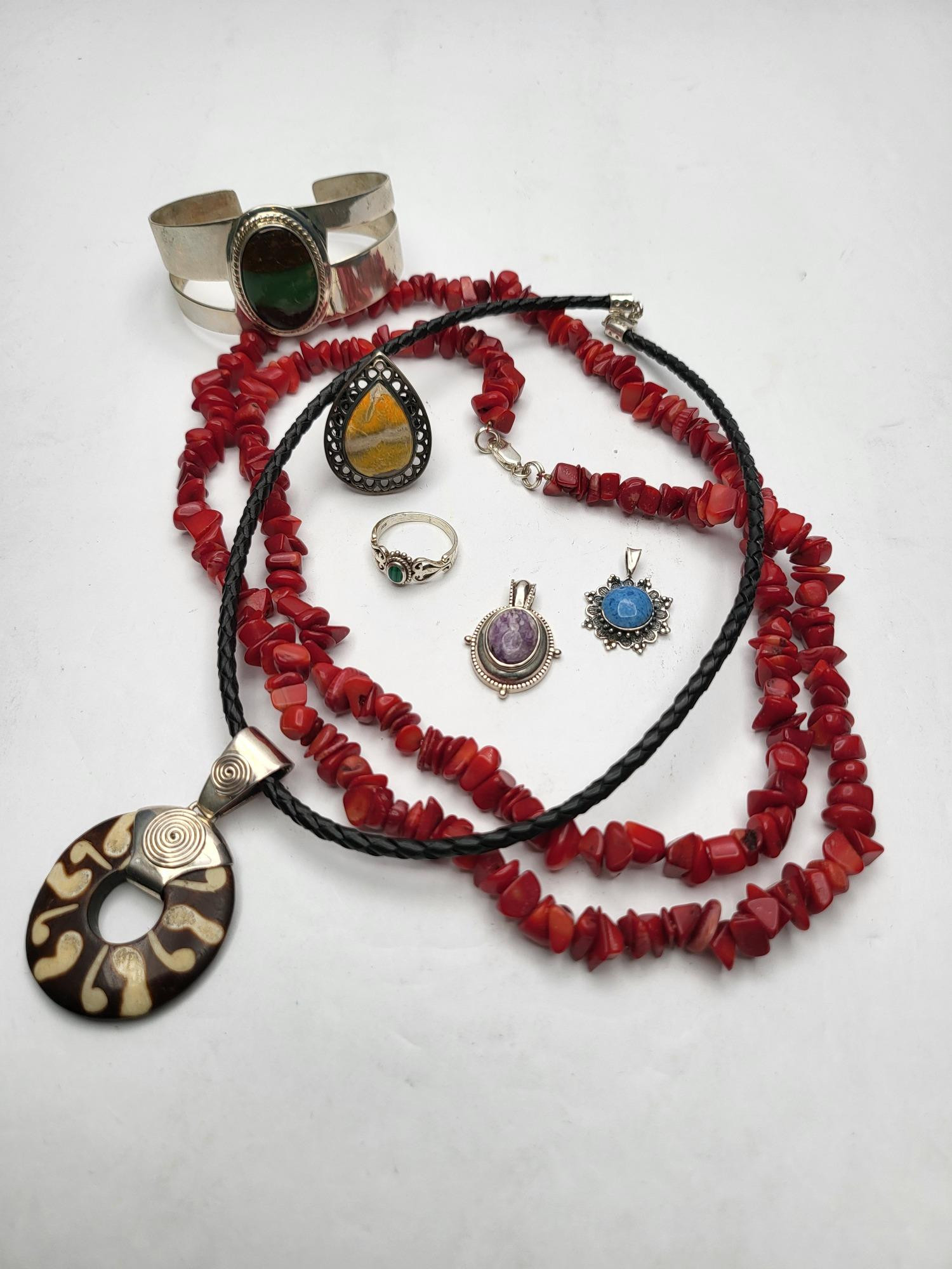 Lot # 27 - Coral, Agate, Jasper Stones Sterling Silver Jewelry