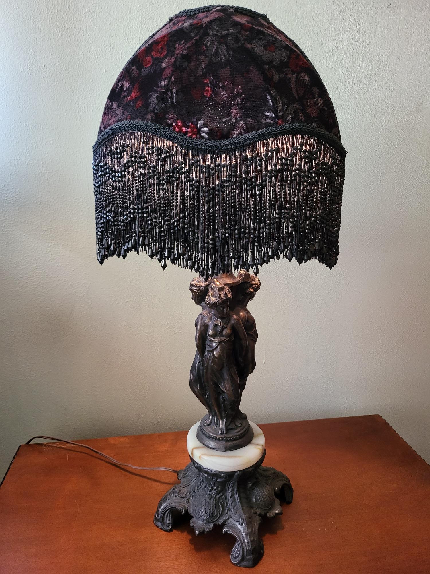 Bronzed metal lamp is 29" tall x 9" base x oblong shade 12" x 6". Black beaded tassels and velvet shade. Missing finial. Works.