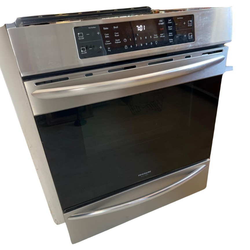 Lightly used 30" Frigidaire Gallery Front Control Range is packed with time-saving features. An easier to clean Induction Cooktop and Steam Clean, offers Air Fry at the touch of a button. True Convection gives you faster and more even baking results. With induction, heat transfers directly to the cookware bypassing the cooktop surface, making induction incredibly fast. Induction only heats the pan and the food in it, so the area around the pan stays cooler. Fast steam cleaning option - a 30-minute light oven cleaning that's chemical-free, odor-free. Start baking in just a few minutes with quick preheat. Get the look of a built-in range, without the remodel; this front control range easily fits the space of your existing 30in range. Buyer will need to remove oven from its location. It would involve disconnecting from hookups and Buyer will need to bring appropriate tools. Counter depth 26.5” deep x 36” height Overall with handle, 30” wide x 30" deep x 36.5” height. Bidding on this lot is an agreement that: (1.) You
