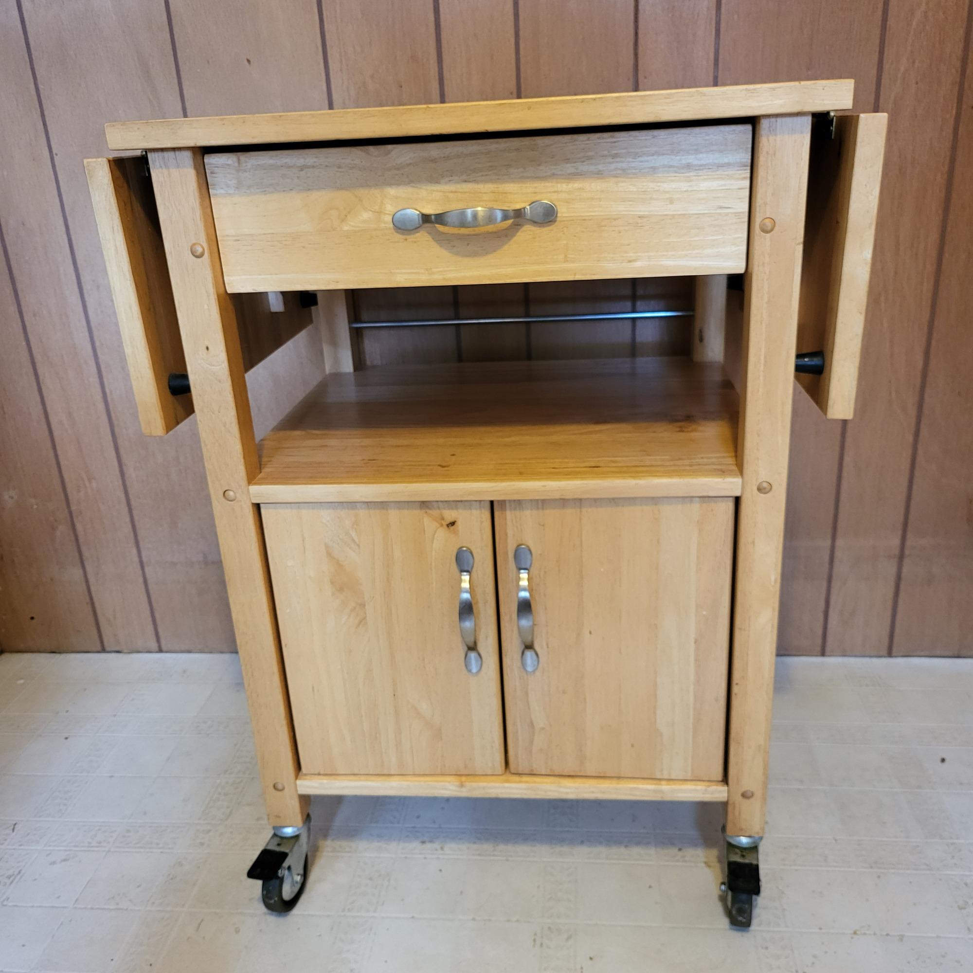Natural wood block rolling cart: Fully extended measures 43" wide (24" leaves down) x 33.5" tall x 20" deep. Two drop leaves. Locking rubber casters swivel 360 degrees. Middle shelf and two door bottom shelf.