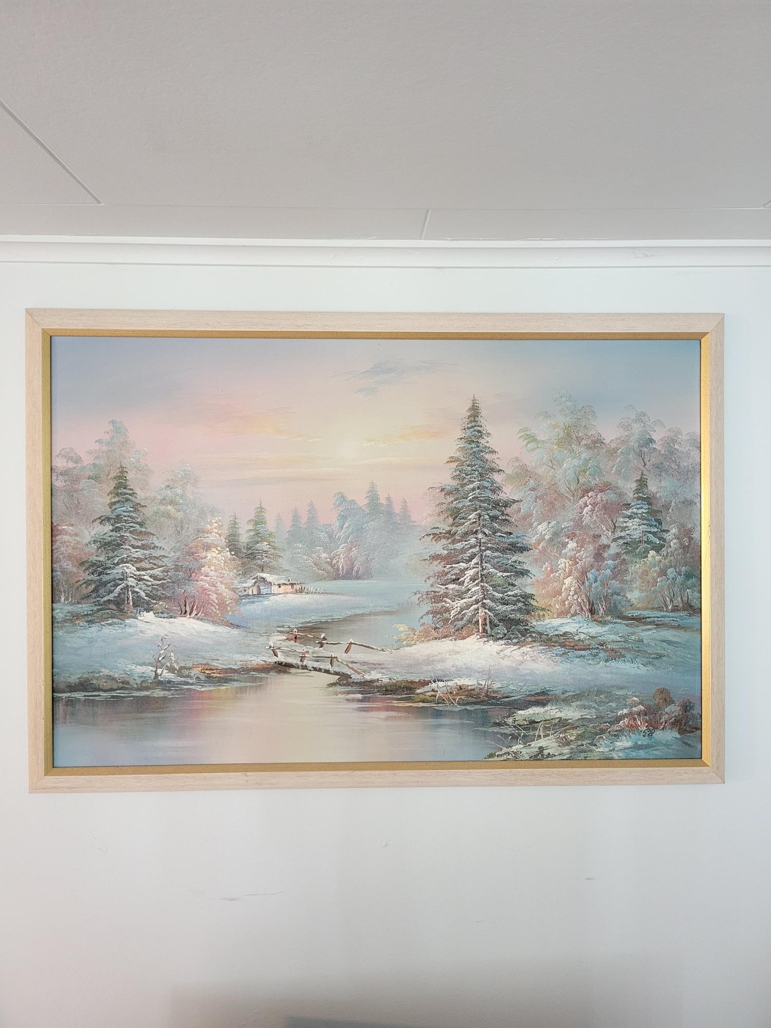 Winter scene landscaoe painting on canvas. It appears to be signed on the lower right corner of the painting but is hard to make out. Light wood frame. Overall measurements 39" long x 27 tall.