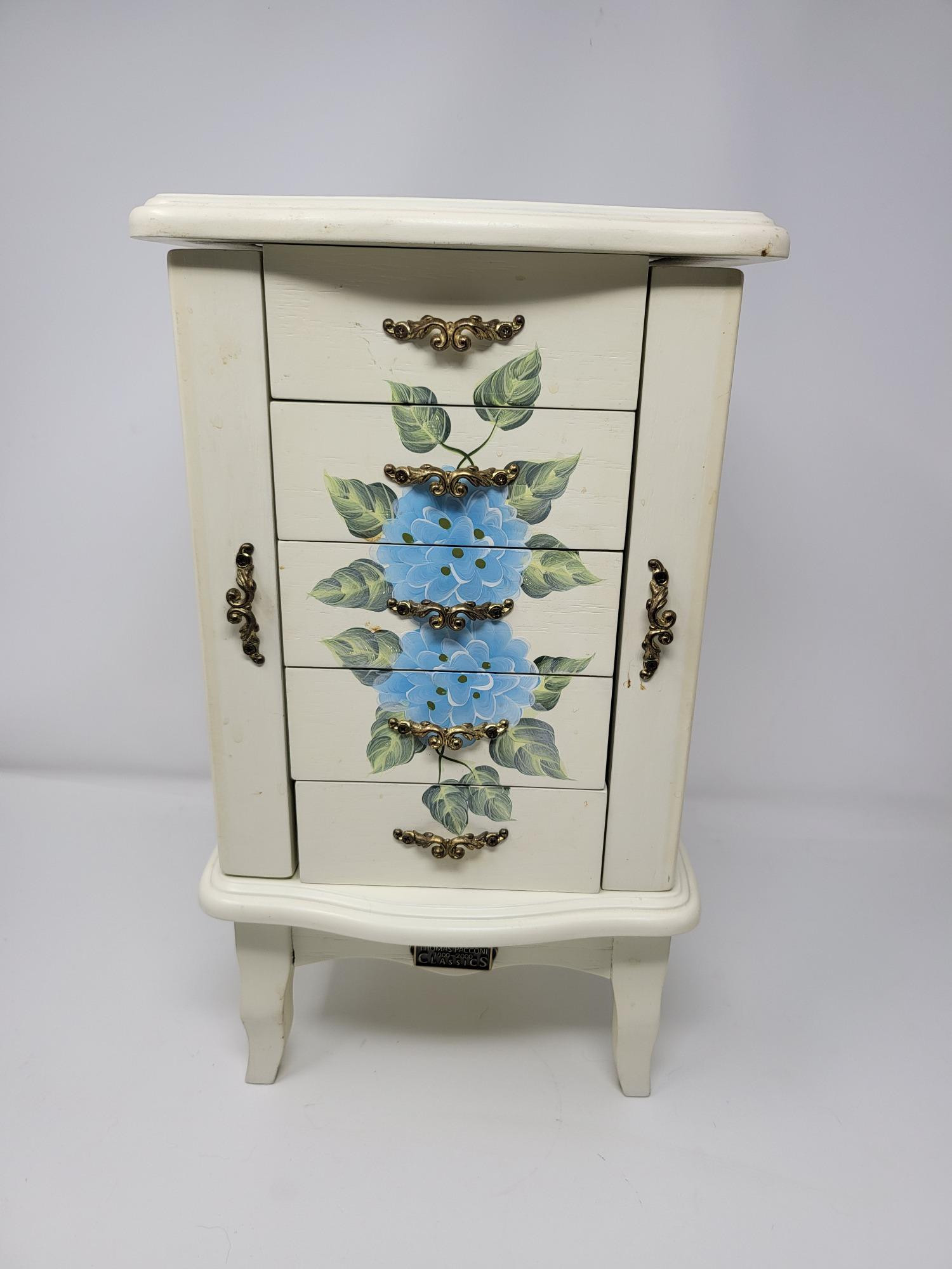 Jewelry box measures 8" wide x 14" tall x 7" deep. White Floral Vintage Jewelry Box by Thomas Pacconi. Hand Painted with blue hydrangea. The top lifts up to reveal a mirror & several sections plus ring storage. Sides open with necklace hooks. Has 4 drawers with a variety of compartments. Lining is powder blue. The hand painted floral design is in good shape with very minimal wear and scuffs.
