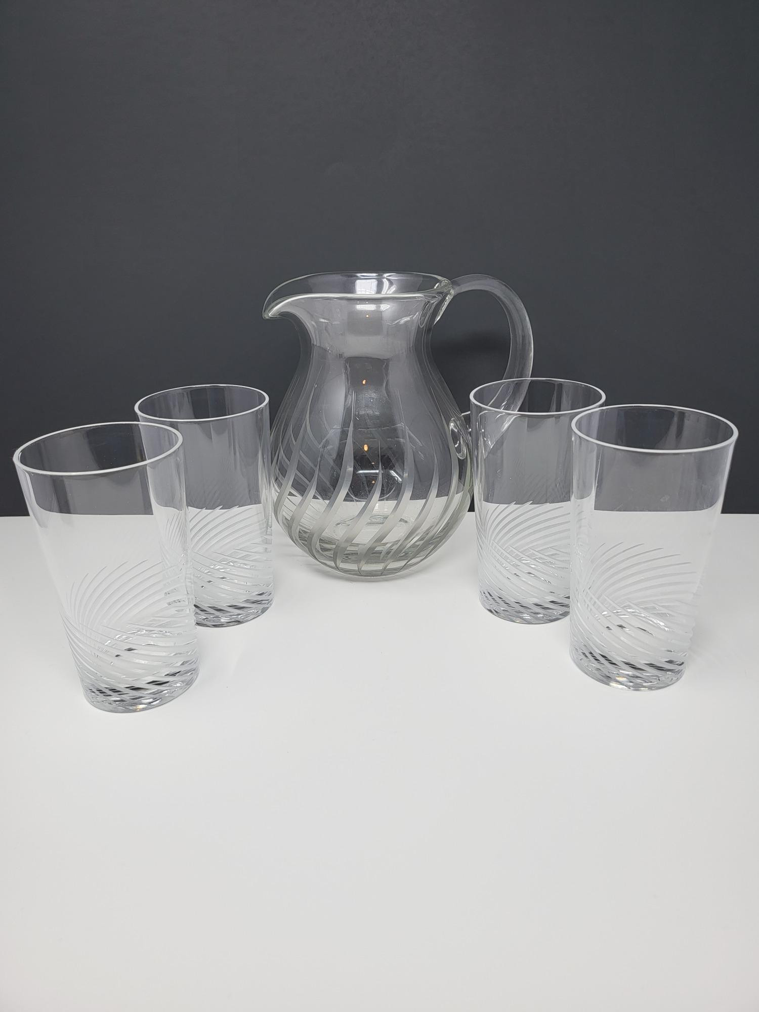 Four 7" tall, frosted swirls crystal glasses. Pitcher is 9".
