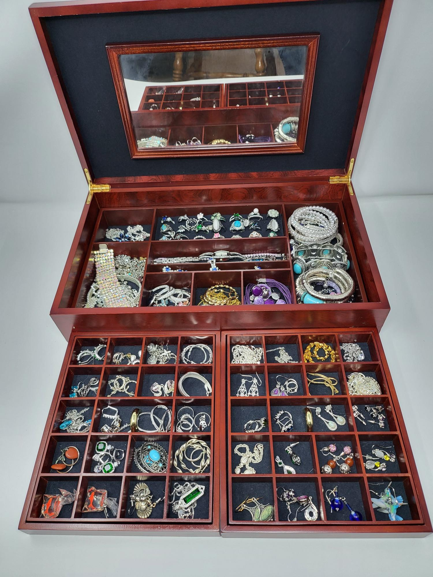 Box is 16" long x 9.5" deep x 3.5" tall with 2 removable compartments. It is filled with all kinds of newer fashion jewelry treasures. Many rings, bracelets, earrings and necklaces.