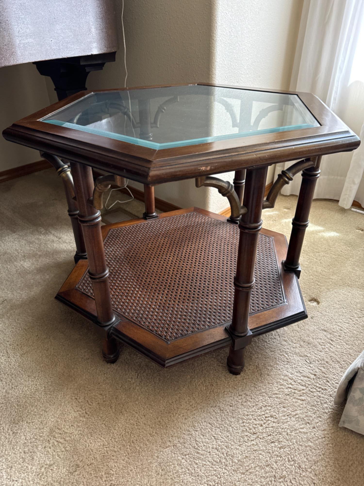 Vintage Lane Octagonal Glass Top Brass & Wood Side Tables Lane style number 1366 53 Bamboo styled brass & solid wood base Beveled glass Standard wear for an item of this age Both measures 26 x 30" x 22.25"T