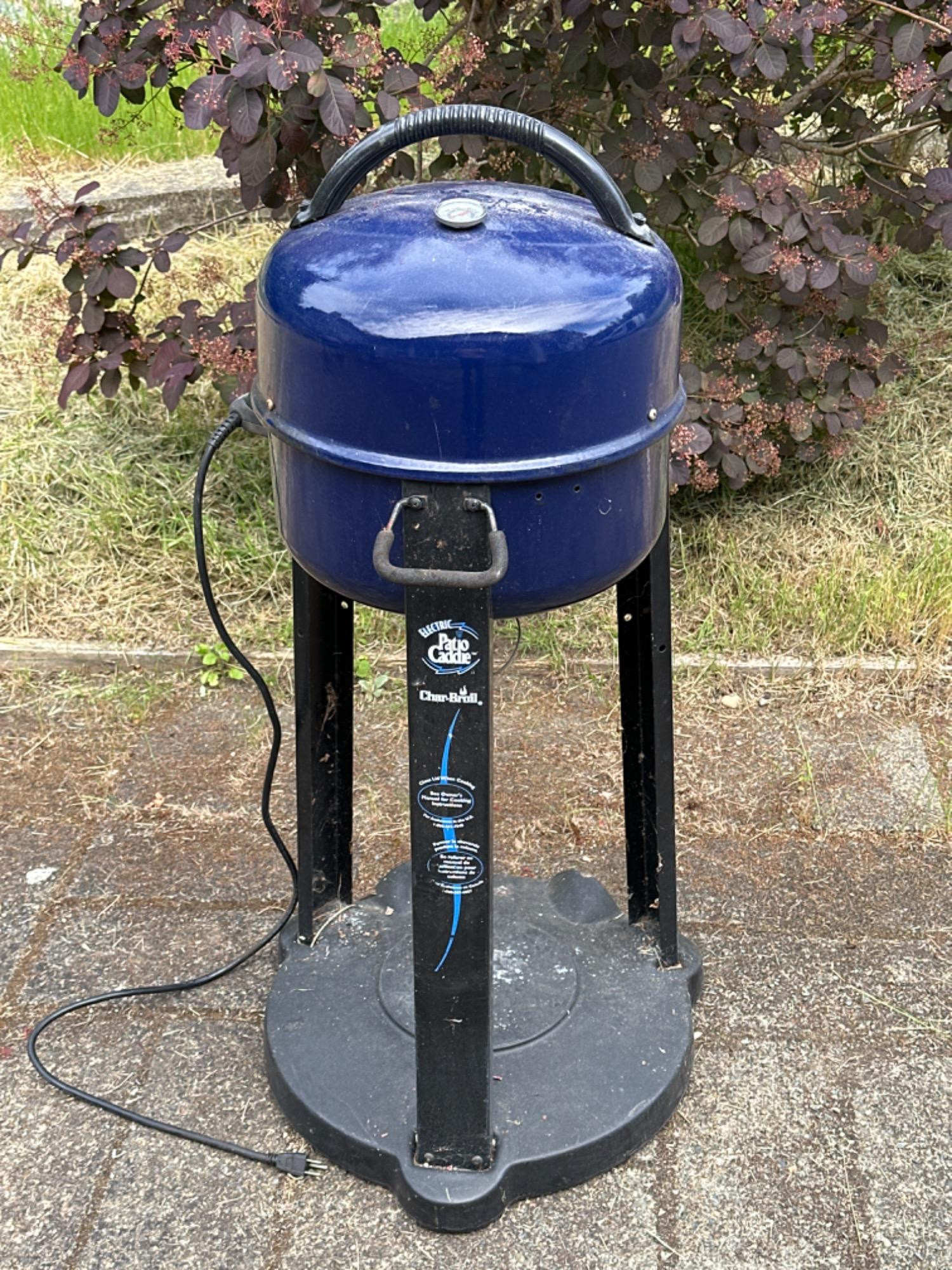 Electric Char Broil Patio Caddie Grill - round blue metal top with black plastic wheeled base Integrated cooking thermometer Adjustable thermostat Cooking surface is 15.5"D 44"T including lid, 34" without, the base is approximately 22"D Tested works, needs cleaning