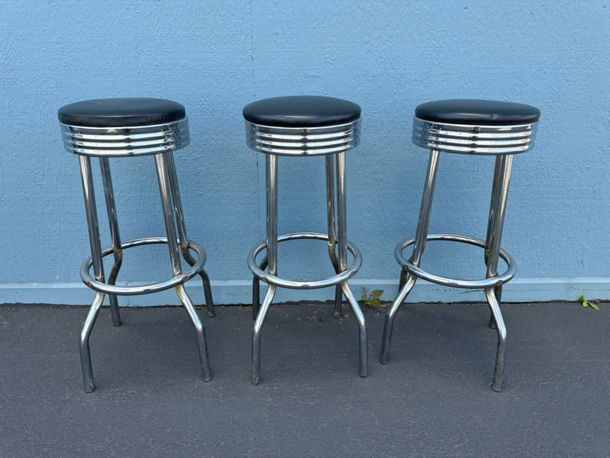 Retro Chrome & Black Vinyl Swivel Bar Stool Trio - 31"T 14"D seat Seats rotate well. Metal has surface rust at bolts - overall good general condition.