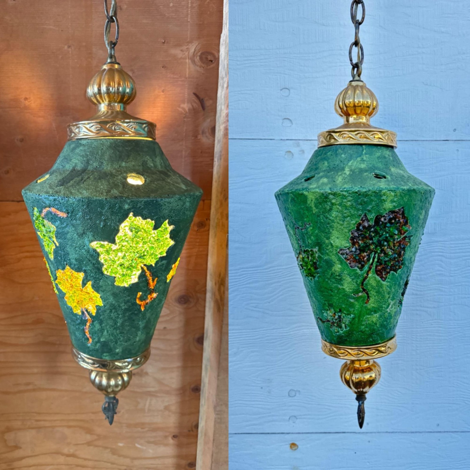 1960s Green Fat Lava Ceramic Pendant Lamp w/Crushed Glass Leaf Cutouts Chip to gold ceramic base piece. Cord 20’, of which 16’ is threaded through the chain Shade is about 10.5”D x 23”T