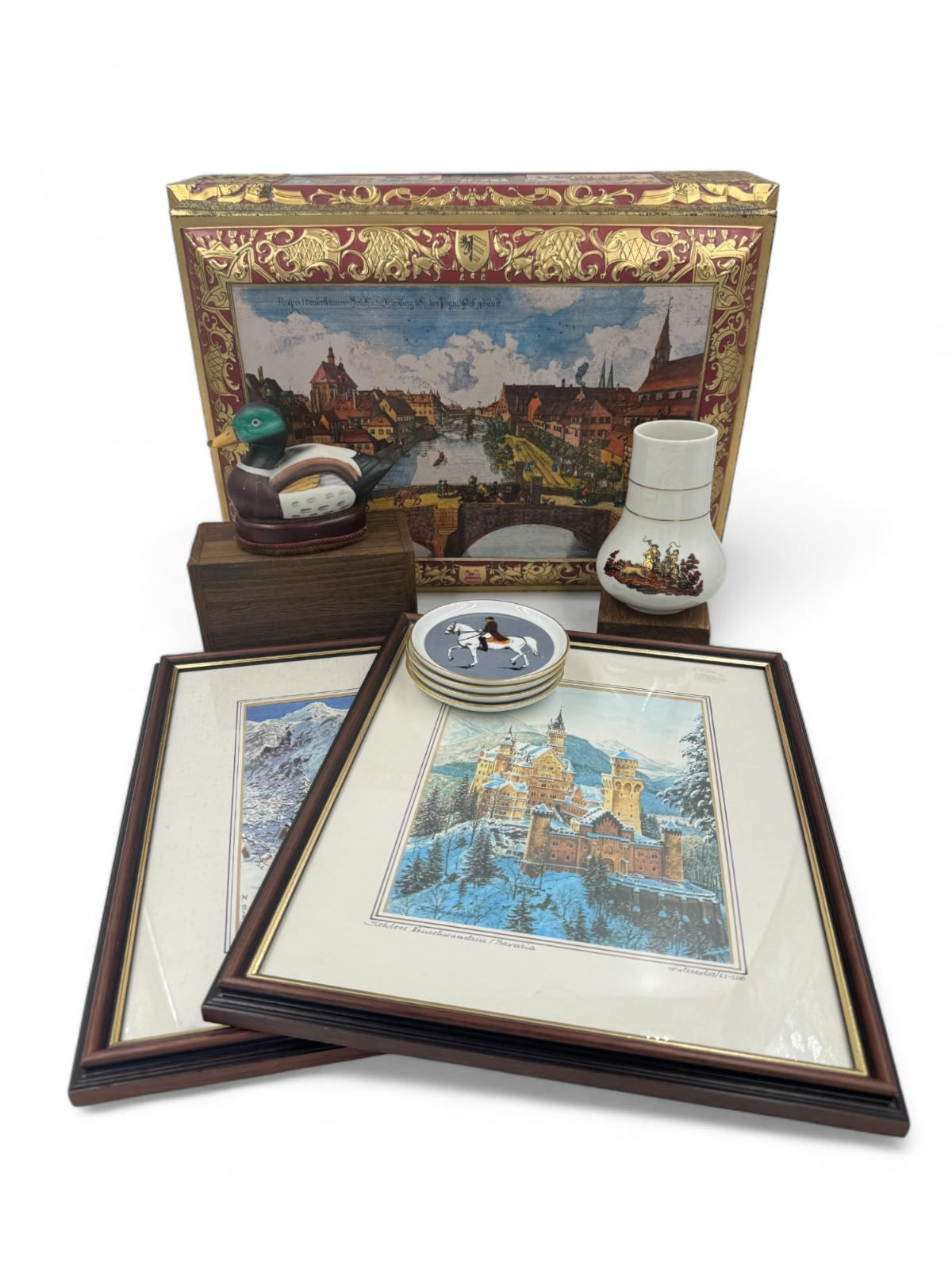 1993 Large Vintage German Cookie Tin E. Otto Schmidt Nürnberg - Made in West Germany Measures: 16.5” x 11.5” x approx 6"T Helmut Krüger 5"T vase - has hairline crack, hard to see (4) Fürstenberg Horse Rider Porcelain Coaster Set - 4"D Porcelain Mallard Duck lint brush - 4"T Framed art prints - frames measure 10.75 x 13"
