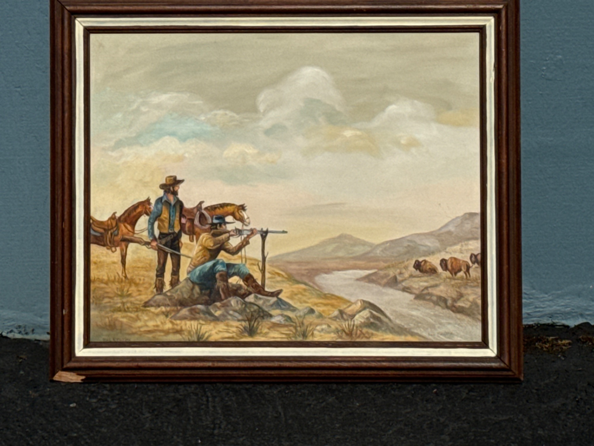 Vintage Original Old West Cowboy Painting by PAUL KUCHARIK Frame has damage, painting is in great condition Frame measures 35 x 29" Signed Paul Kucharik Please read- This painting does not come with a COA. Sound Estate does not have prior history of this painting.