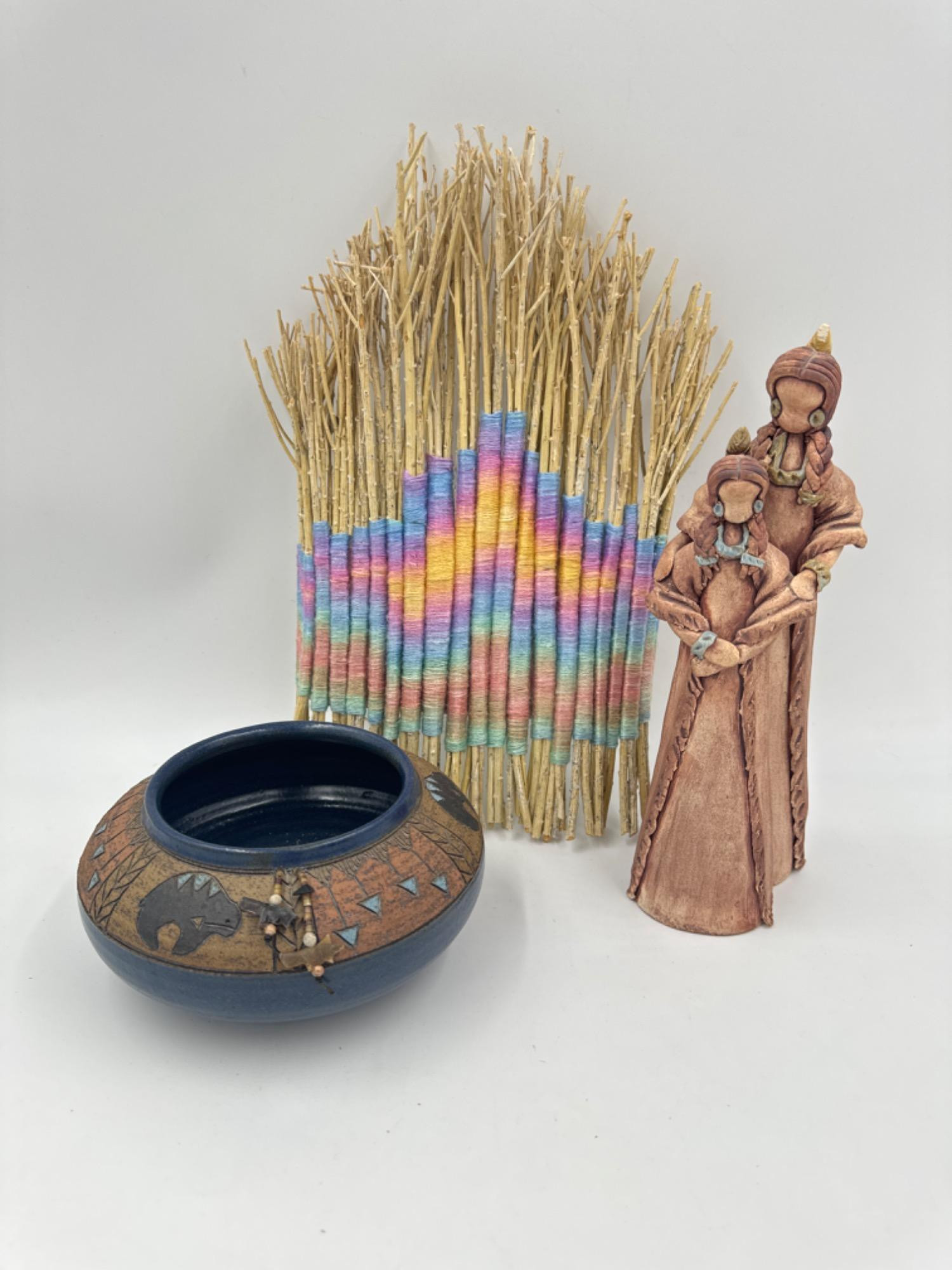 Engraved pottery bowl by Mary Tuttle diameter approximately 6.75" - great condition Mother Daughter statue signed 'Jennifer' - 10.25"T - top of the feather is damaged on the motherly figure Pat Walls "Lights of the Southwest" - 7.5"W by approximately 13"T