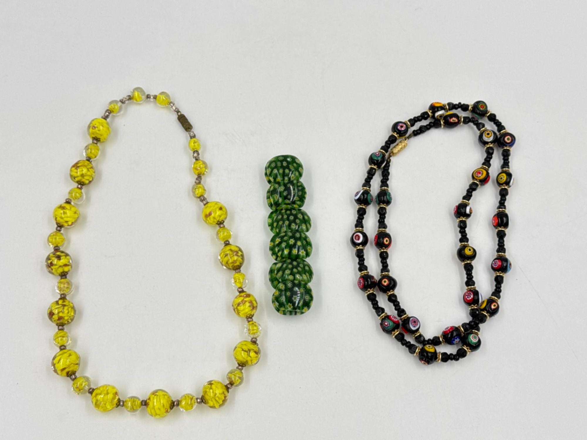 Vintage Millefiori Glass Bead Necklace & Bracelet Murano Yellow & Gold Glass Bead Necklace 28”, 18”, and 8” total lengths