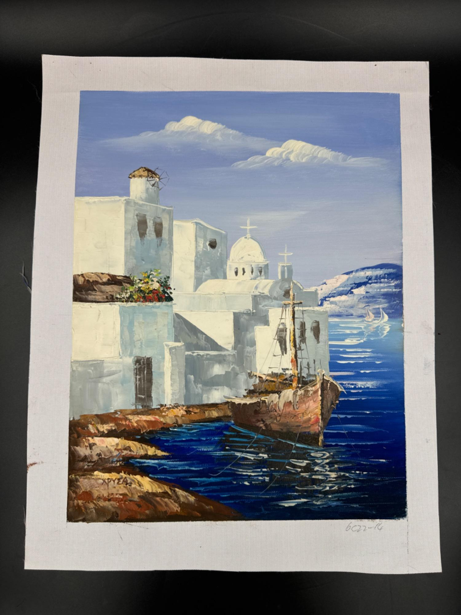 Signed Original Greek Island Seascape & Ship Oil Painting 15" x 19" full canvas size